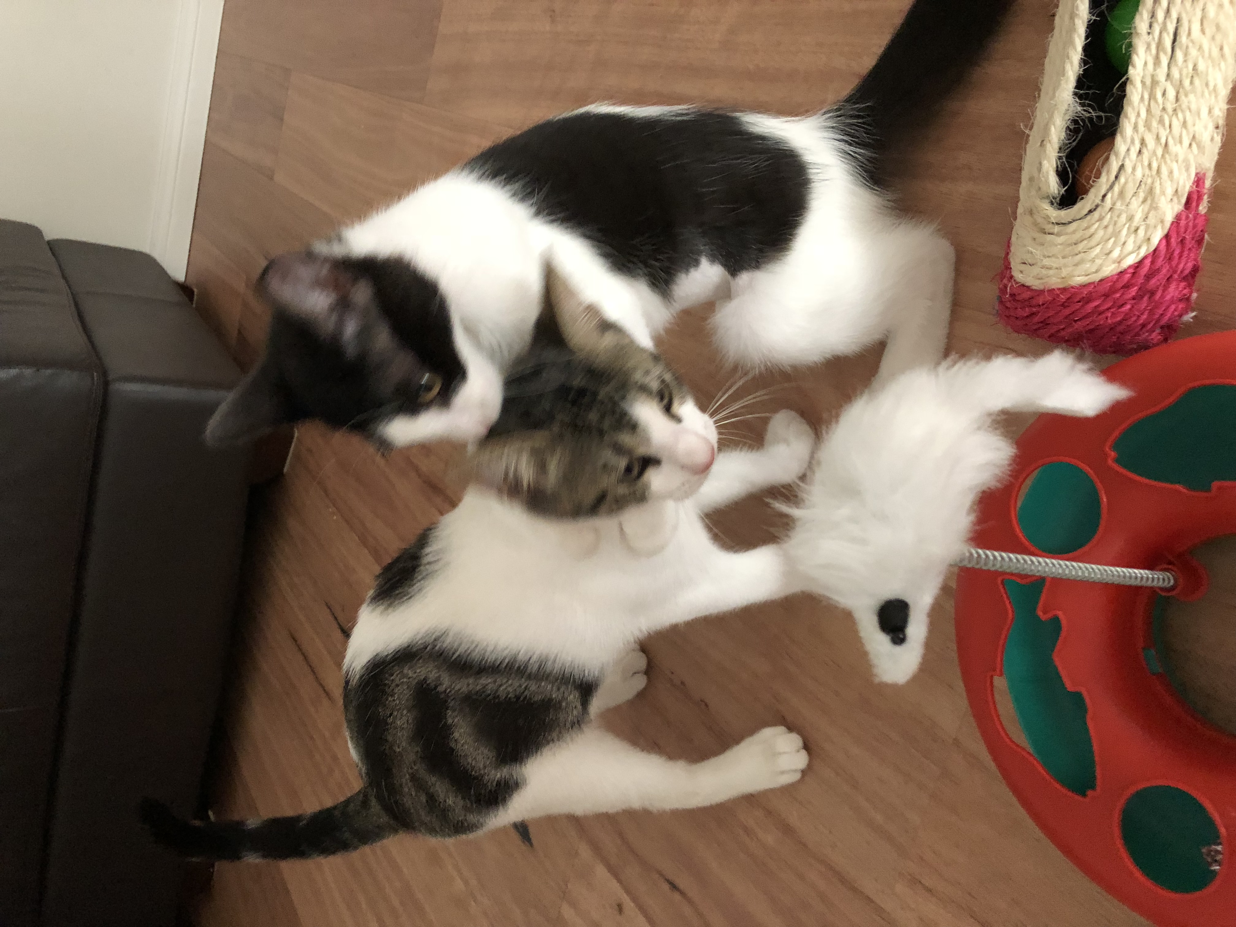 Fidget (black and white) and Max (white and brown tabby) were both surrendered into seperate veterinary clinics in opposite parts of Sydney. They were paired up by the veterinary nursing community so they could have siblings to play, develop, nip, wrestle, groom and snooze with! And now we've created a lasting brotherly bond. These guys do everything together; Fidget is confident and adventurous, testing the waters for the more shyer and reserved Max, who just needs a little reassurance sometimes.