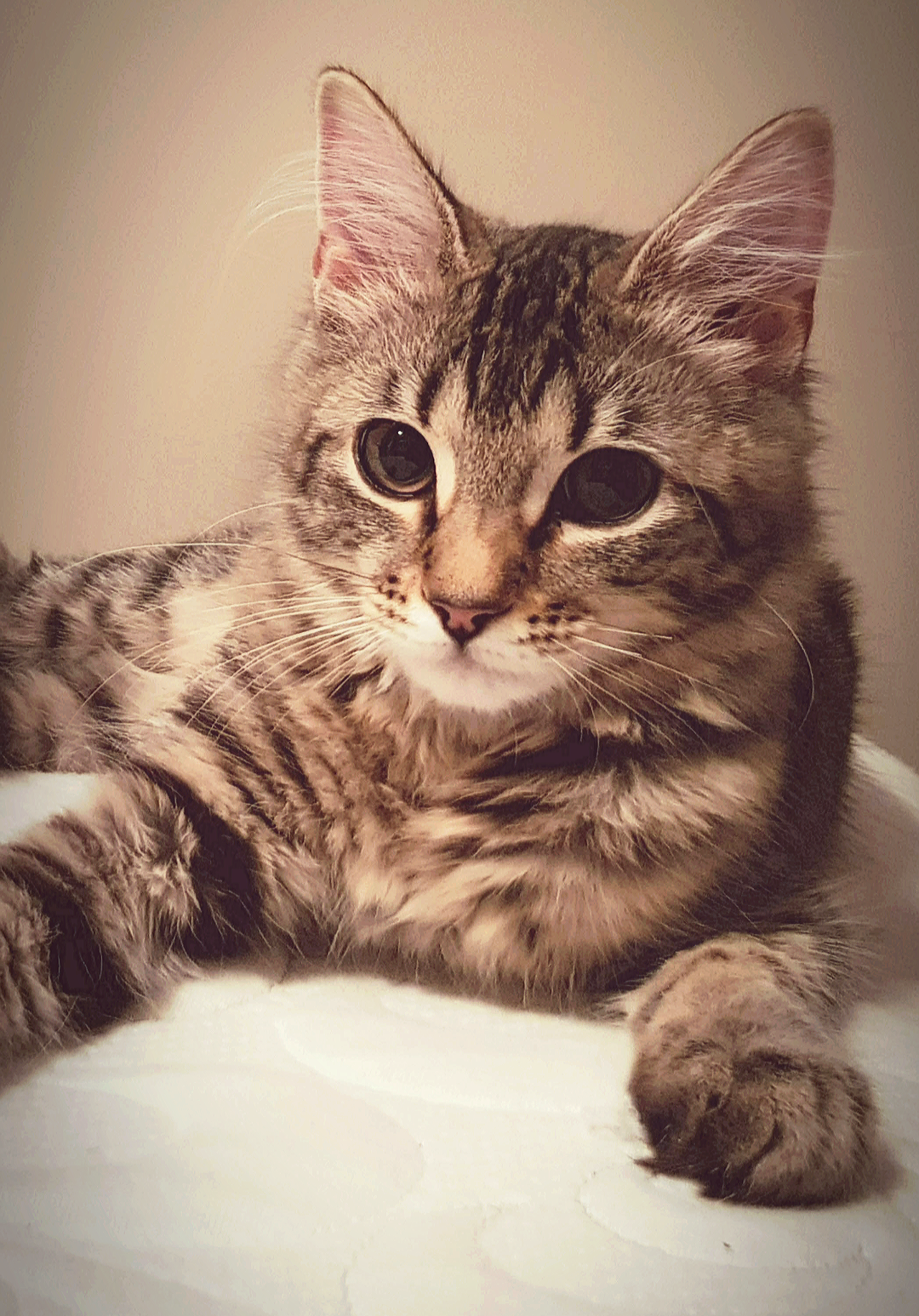 Louise is a stunning girl- it's hard to capture just how beautiful she is in a photo. She has broken mackerel tabby stripes that leave her warm brown coat covered in little black spots. Very unusual and absolutely divine.