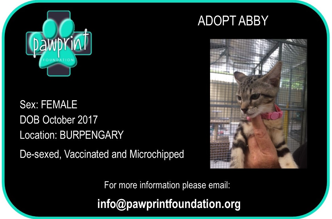 Abby has had all her vet work done & is vaccinated, mirco-chipped and de-sexed. She playful, energic and has a Cheeky side!