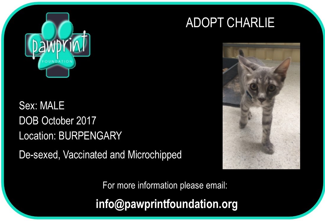 Charlie has had all his vet work done & is vaccinated, mirco-chipped and de-sexed. He is playful, energetic and has a Cheeky side!