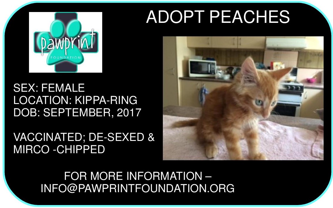 Peaches is De-sexed; micro-chipped and Vaccinated!