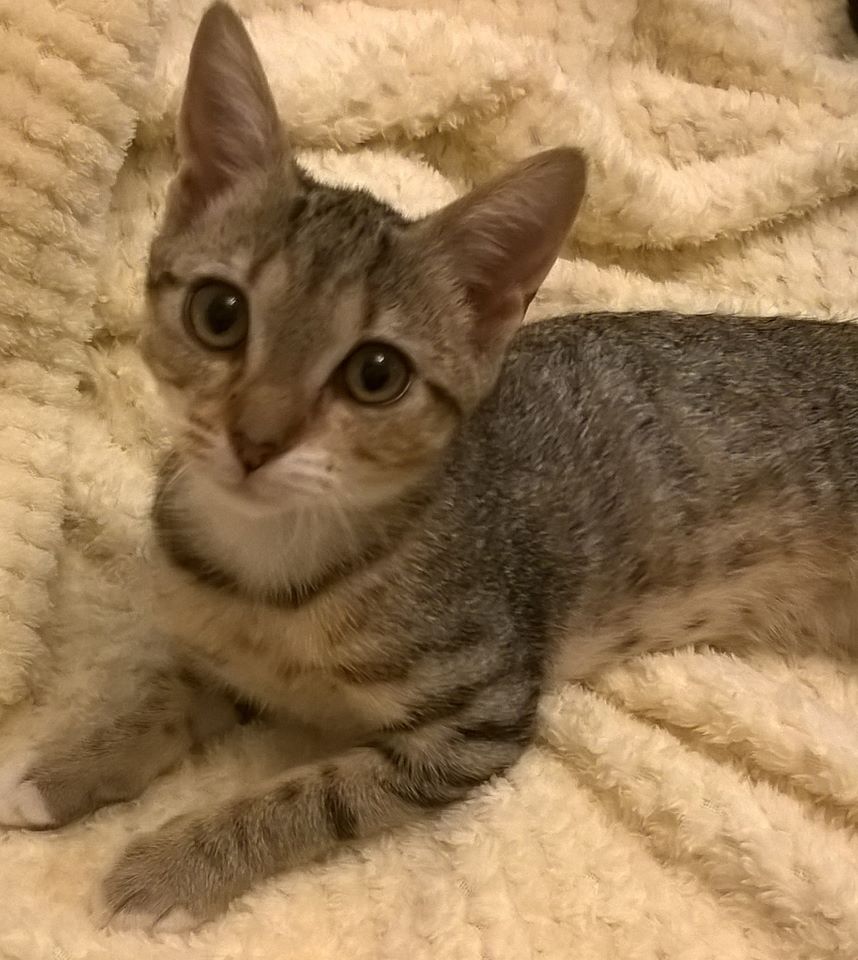 Gorgeous tabbie alert! Bambi is a sweet natured and intelligent little girl who was rescued along with her brother Graham from the streets. At first she was a scaredy kitty but this soon changed with some love and attention and she turned into a delightful imp. As with most kittens she is highly curious, into everything and a total gad about. Bambi likes being indoors.