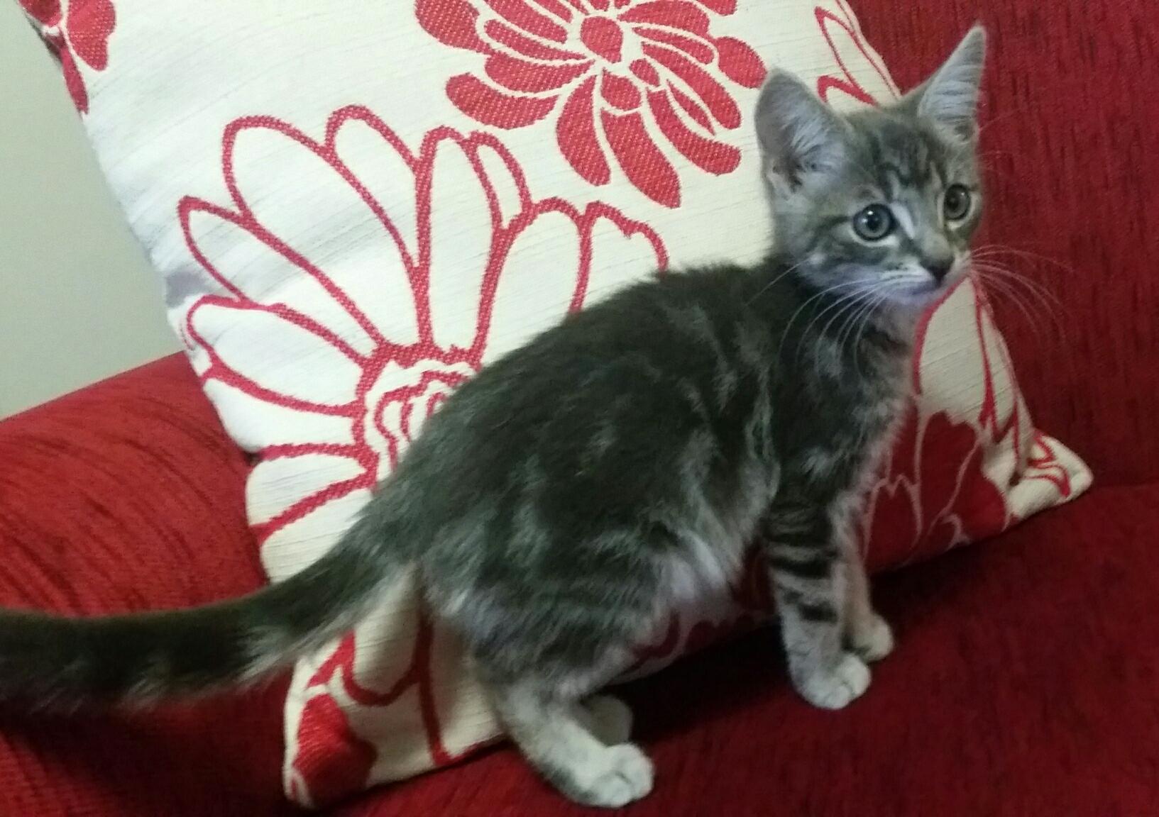 Roo is a friendly playful kitten who loves to chase toys, pounce and wrestle other kittens.