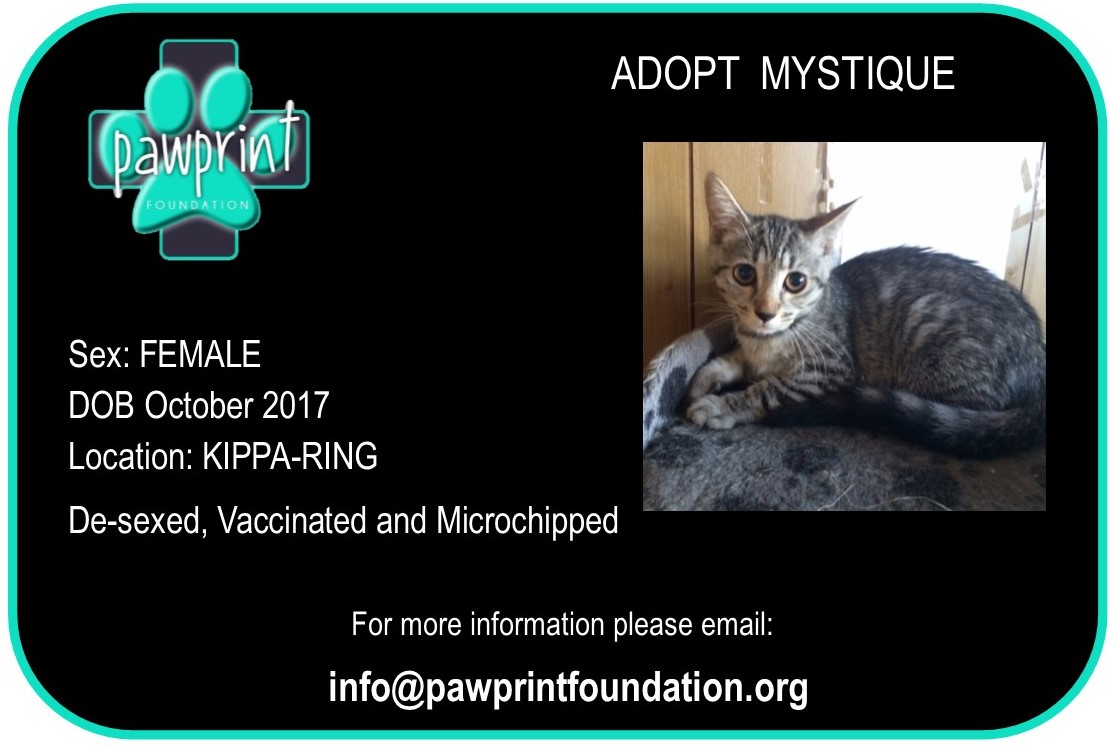 Mystique has had all her vet work done & is vaccinated, mirco-chipped and de-sexed. She playful, energic and has a Cheeky side!