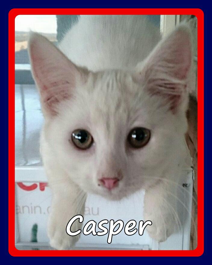 Hi I'm Casper. I am a cheeky, inquisitive, playful and action packed little girl. I came into foster care with my siblings when I was 2 weeks old and we were all hand raised. So we adore our humans. I happily live in foster care with other cats/kittens, dogs and my big and little foster carers. When I am comfortable I have a big purr and enjoy chin rubs and ear scratches and love to play and be active. I am an indoors only kitten, especially due to my white coat and pink nose which makes me more susceptible to skin cancers. But I love it best there because I feel safe and love being near my family. I will fit into any kind of home with some time, patience and understanding to adjust to a new environment and when settled I will give lots of love and kitty cuddles.
