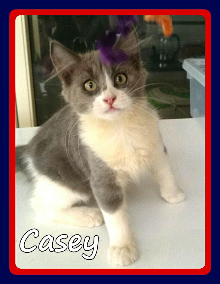 Hi I'm Casey. I am a super sweet and snuggly little girl. I came into foster care with my siblings when I was 4 weeks old. So we adore our humans. I happily live in foster care with other cats/kittens, dogs and my big and little foster carers. When I am comfortable I have a big purr and enjoy chin rubs and ear scratches. I love to play and have lots of cuddles right under your chin. I am an indoors only kitten, but I love it best there because I feel safe and love being near my family. I will fit into any kind of home with some time, patience and understanding to adjust to a new environment and when settled I will give lots of love and kitty cuddles.