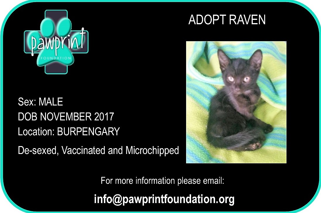 Raven has had all his vet work done & is vaccinated, mirco-chipped and de-sexed. He is playful, energetic and has a Cheeky side!