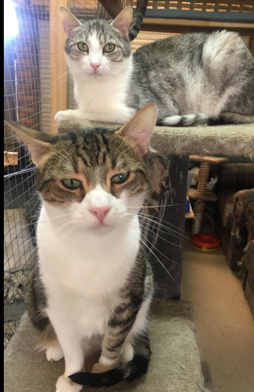 This bonded brother and sister are some of our longest residents and have been looking for a home for easily over 12 months . They are both very lovely respectful cats who get along with the other animals I think they get overlooked because they crouch when you first put your hand on them to pet them but they don't have a bad bone in their bodies they are finally getting used to the idea that some humans are actually pretty cool . Can anyone offer these two a permanent residence to call their own ? Their names are "Brin" and "Tully" they are 4-5 years old fully vet worked . Adoption fee $60 for the pair