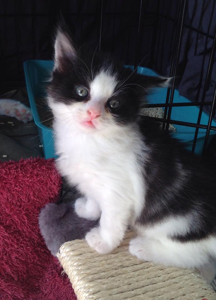 Panda is just a beautiful black and white kitten. He loves following his closest human around meowing to gently remind them when it's mealtimes and also playtime. Panda relishes feline and human company and delights in any toy around. Panda would love to be adopted to a home that has 1 or 2 pets already or as a pair with another foster kitten