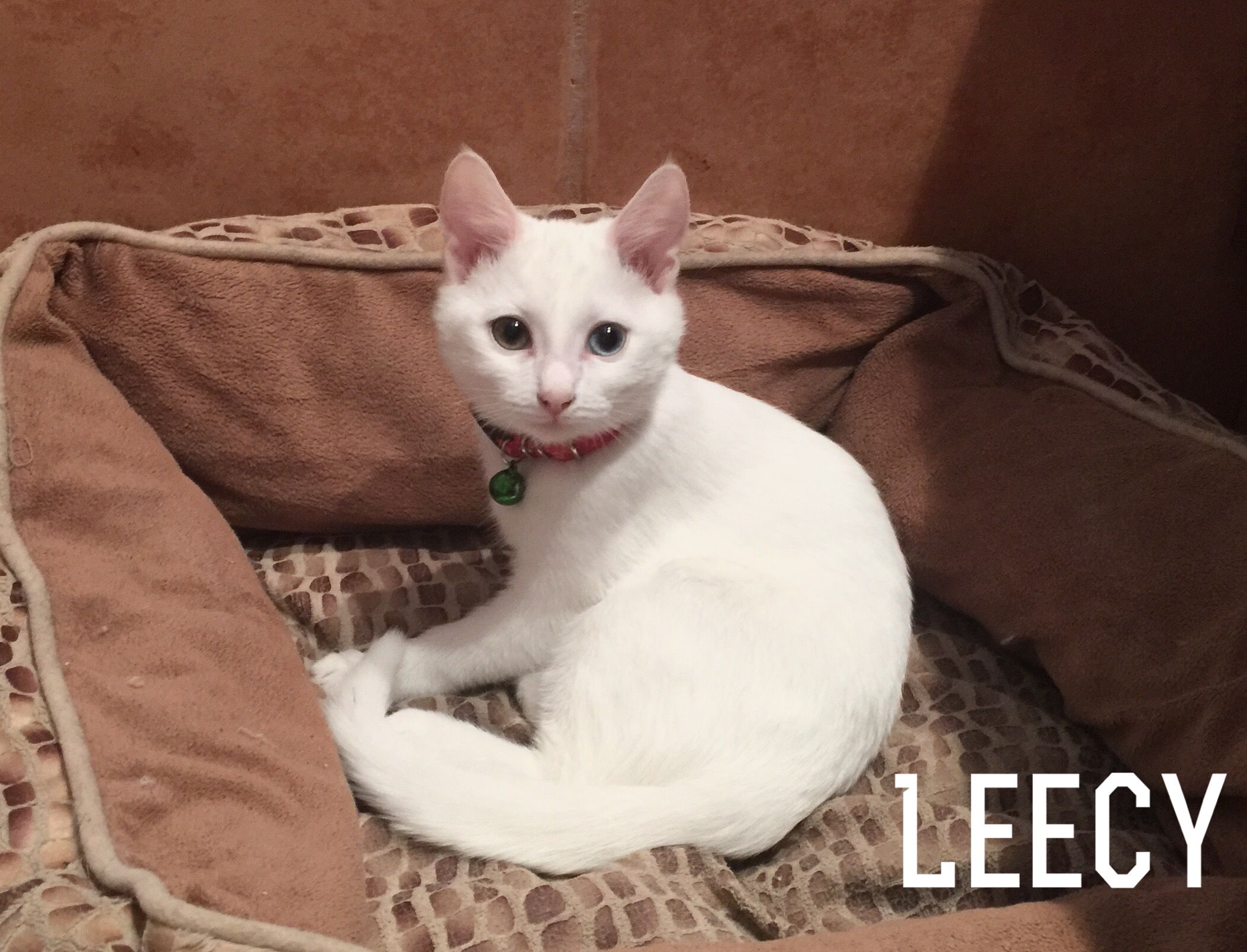 Leecy comes from a litter of 5 all white kittens. 4 out of 5 are deaf. Being deaf is not going to stop her having a full and happy life. It does however mean that she needs to be kept as an indoor only cat. It is never recommended that white cats are outdoor cats and certainly not a deaf white cat.