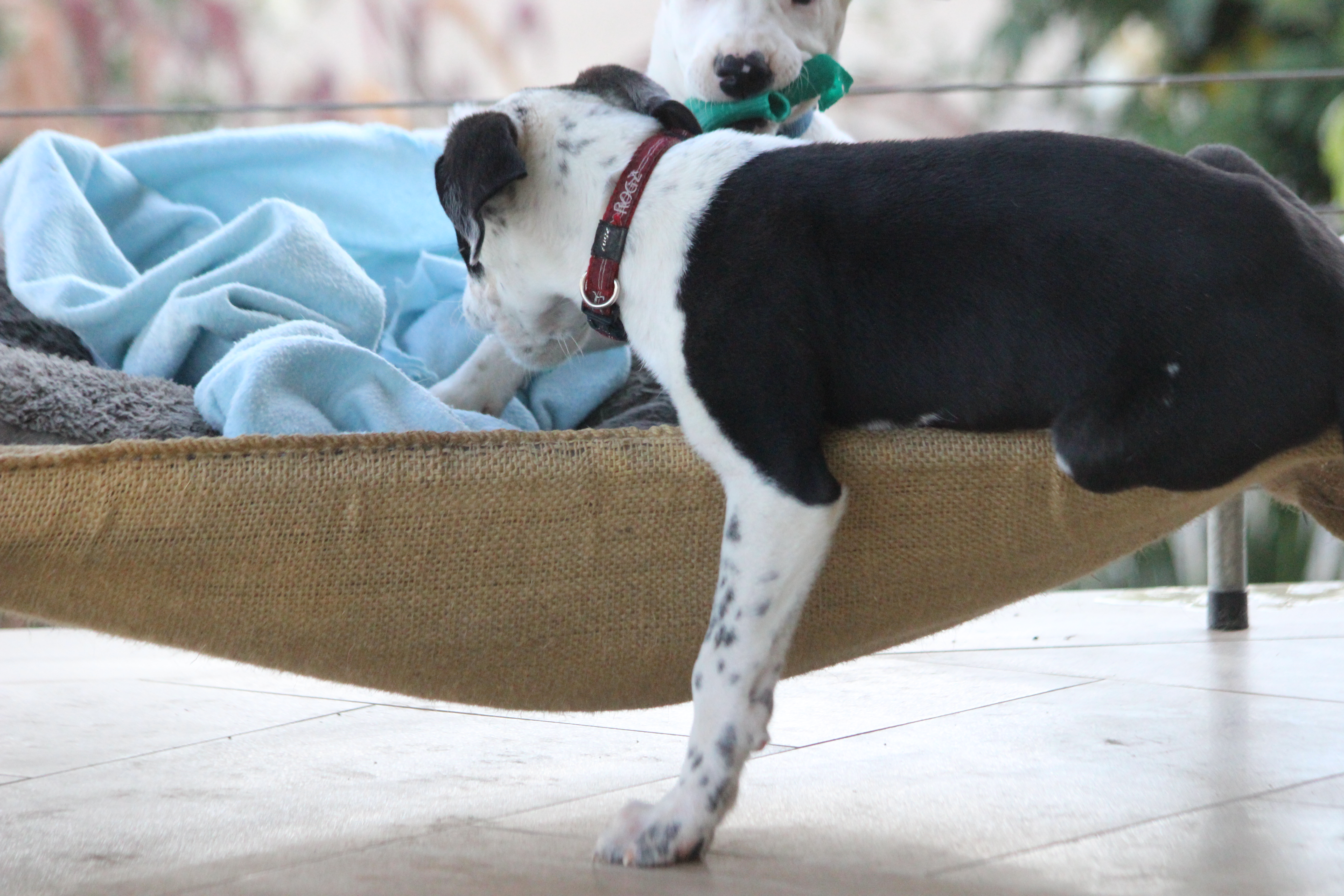 Louie is a quiet pup when he is on his own, although he can be a bit of a loner when the other dogs are playing he is often sitting chewing on something he has found. Being a puppy, he likes to chew on things so will need lots of chewy toys He is very social and is used to big and small dogs and will play rough with the best of them but he is just as happy to sit at your feet.