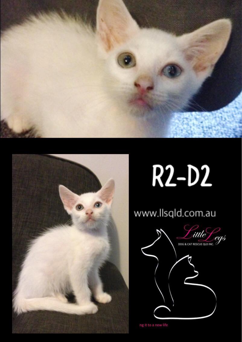 Have you seen R2-D2's eyes? One green & one blue. A gorgeous odd-eye kitty. He is partially deaf but this doesn't effect him other than he may be surprised my sudden movements more than you'd expect a kitten to be.