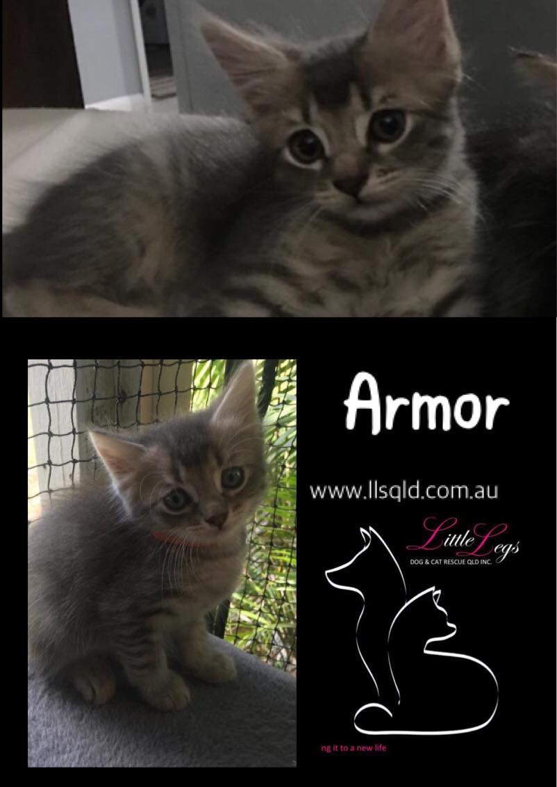 Pretty little Armor is a well-mannered, sweet, quiet girl. She enjoys playing with her brothers and sisters, but is quite wary of the dog. She is being raised in a busy family home, with young children and other cats and dogs.