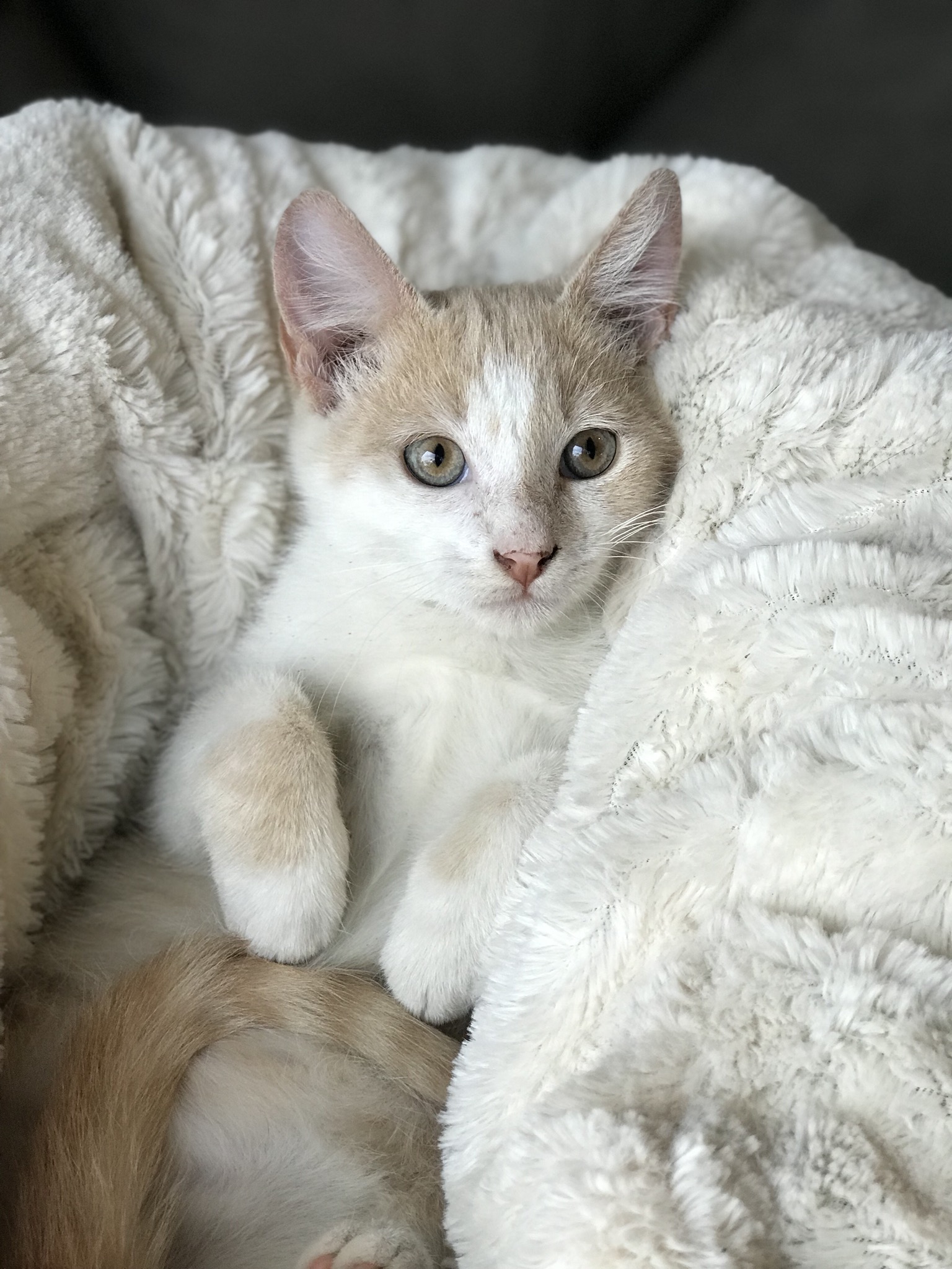 His soft colouring matches his calm nature until its kitten rumble time. He enjoys the company of the other kittens in care and even more enjoys that he is slightly larger and wins every time.