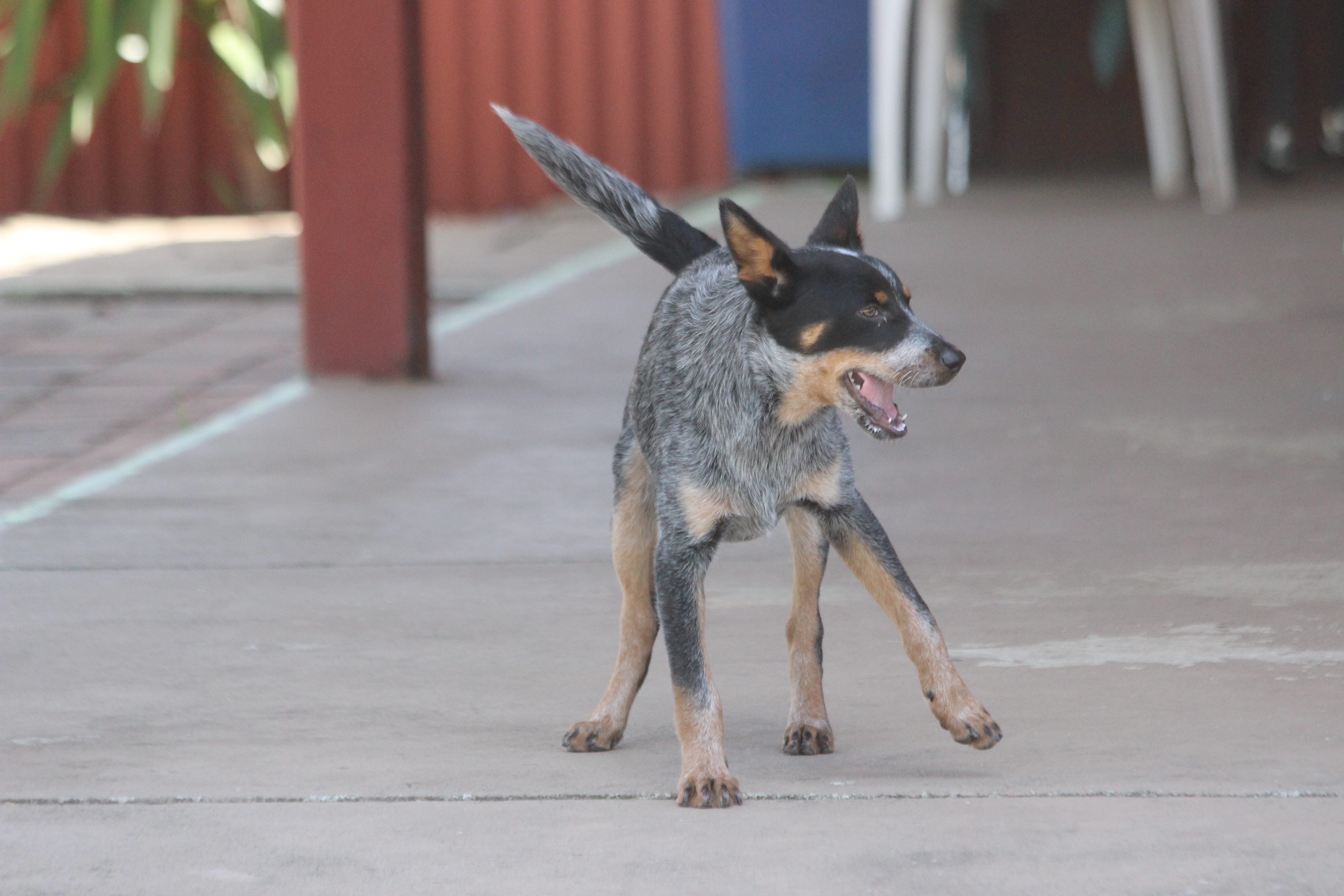 He is a heeler x and at 6mths old he has learnt now to sit, wait for his food. like the cat and his latest trick is to actually tolerate chickens..