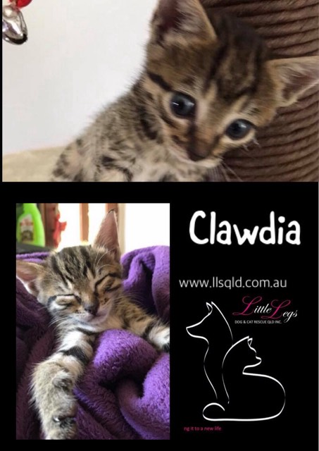 Clawdia was the smallest but caught up to her siblings with her healthy appetite and her hunger for affection. She is content to rest on your chest while you watch tele, but Clawdia is also curious and will play and investigate what is happening within her environment
