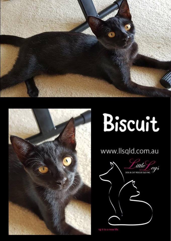 Biscuit is a kitten with a beautiful sleek coat and large yellow eyes. She is like a mini panther. She is very active and outgoing with a lot of energy. She is very intelligent and wants to be a part of everything that is going on. She plays well with other kittens and an older cat that is 10 months old. She would fit in well with older cats with a bit of time.