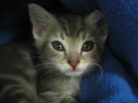 Frankee is a one of a kind cat! he has a huge personality and just adores people! he was found abandoned and bought into the stud park vet hospital as a stray and was cared for by the nursing staff. He is approximately 7 weeks old and has a short, grey tabby coat. He loves to play with the other kittens at the hospital but is also quite happy to let his imagination let loose by himself. He's the kind of cat that will purr as soon as you look at him. He loves to cuddle and curl up under the doona covers with you. He is growing into his playful side and loves to just run wild!!