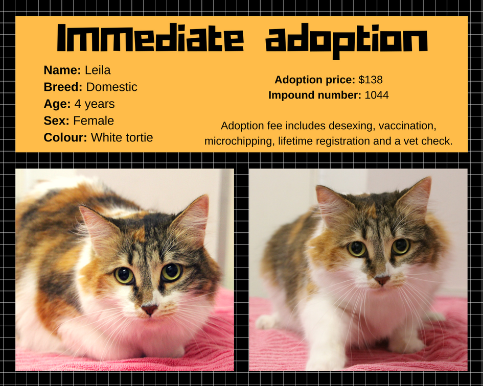 Leila's impound number is 1044 and her adoption price is $138.
