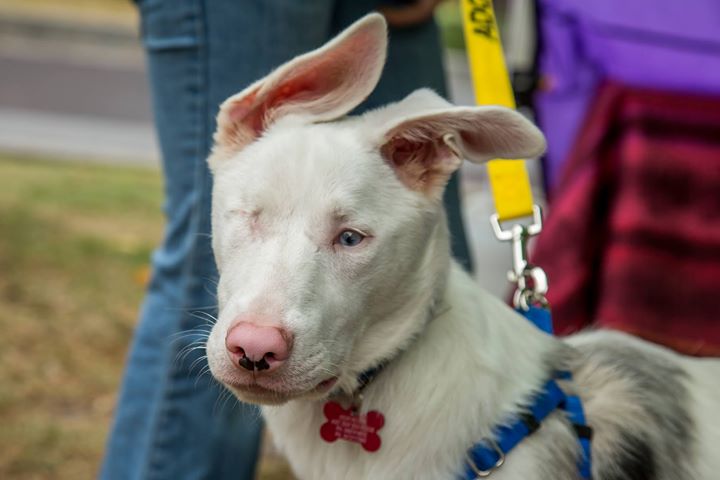 Halo is deaf. He also has microphthalmia. His right eye was removed due to complications with his microphthalmima. He has reasonable vision in his left eye, but has been trained with touch commands.