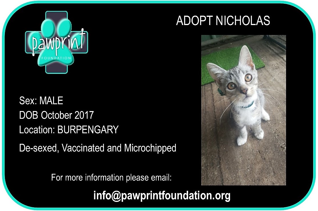 Nicholas has had all his vet work done & is vaccinated, mirco-chipped and de-sexed. He is playful, energetic and has a Cheeky side!