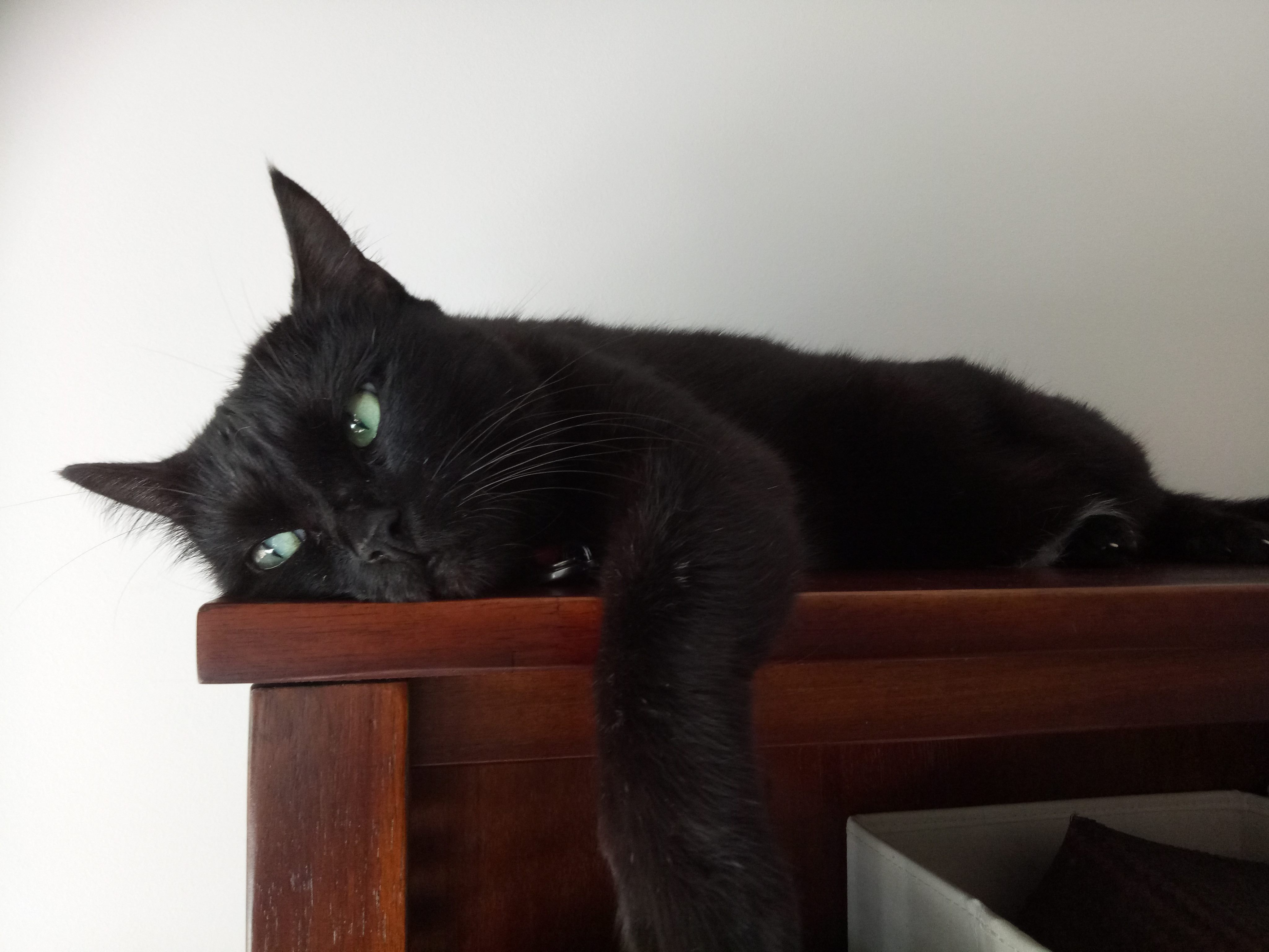 Olive with the gorgeous green eyes, was brought into the Southside surgery on deaths door. She was found in a gutter, unable to move with tick paralysis. She currently lives at the vet surgery but doesn’t really like it there. Too many dogs & cats invading her personal space. She can also be quite opinionated about with whom & when she is petted and, as a result, gives the wrong impression of her true nature. One of the nurses takes her home regularly on weekends and finds her to be a most welcome guest. She is unobtrusive, happy to find a spot in a window to sleep in and enjoys a play in the evening (preferably a toy mouse on a string). She is a sweet, gentle cat with a very funny meow. She loves to sleep on the end of the bed every night. A cuddle and a bit of stroking will elicit lots of purring, if she’s in the mood. Olive adores eating grass and wet food. Due to her independent nature she would suit a home with a single person or couple. All her vet work has been done and includes desexing, microchip, vaccinations, flea and worm treatment.