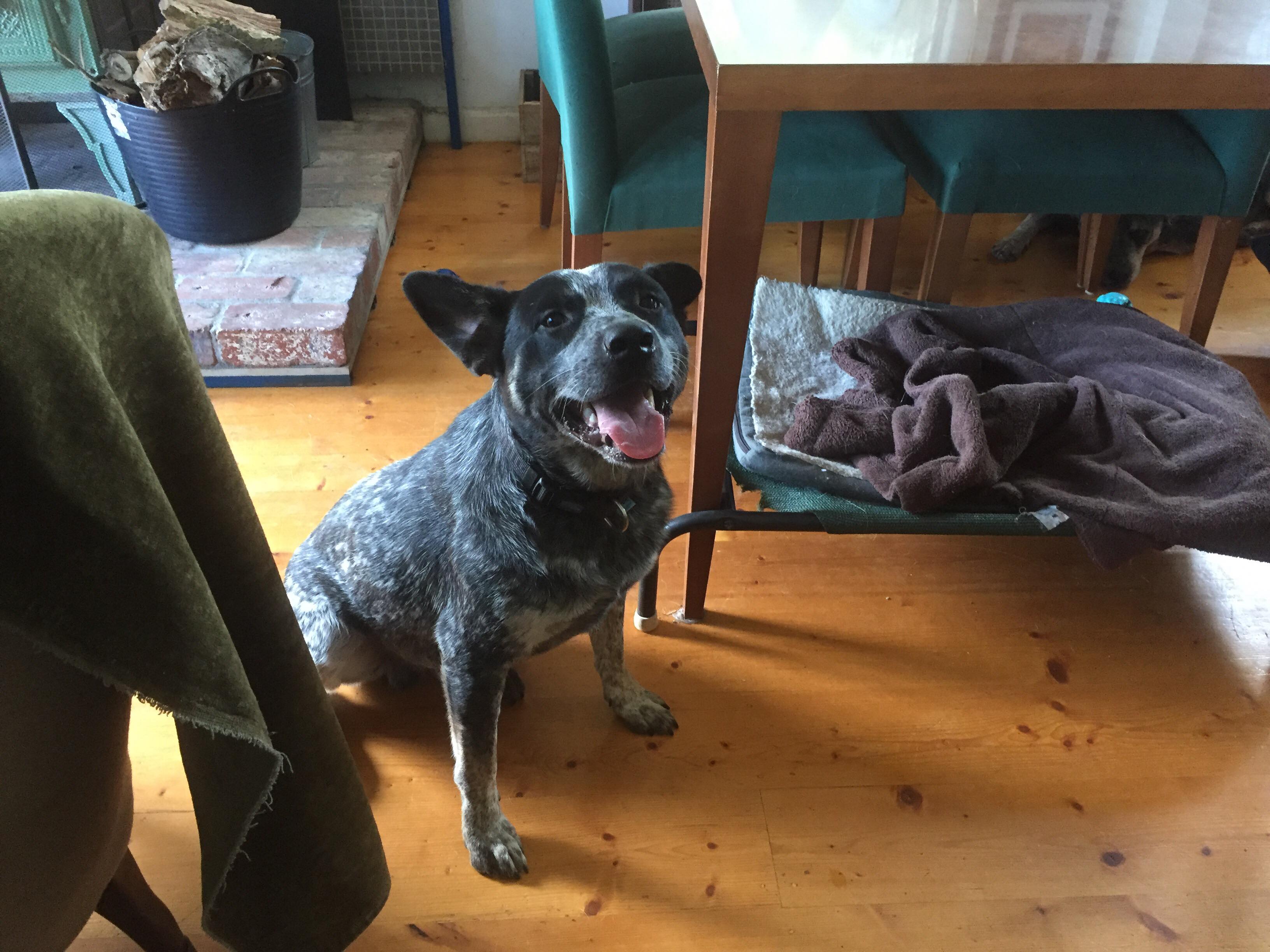 House trained and not destructive. Good with other dogs. Good with cats after a brief meeting only. Friendly, likes playing with other dogs. Not very interested in the chickens, horses, sheep etc. Doesn’t run off when off lead but a bit lazy with recall.