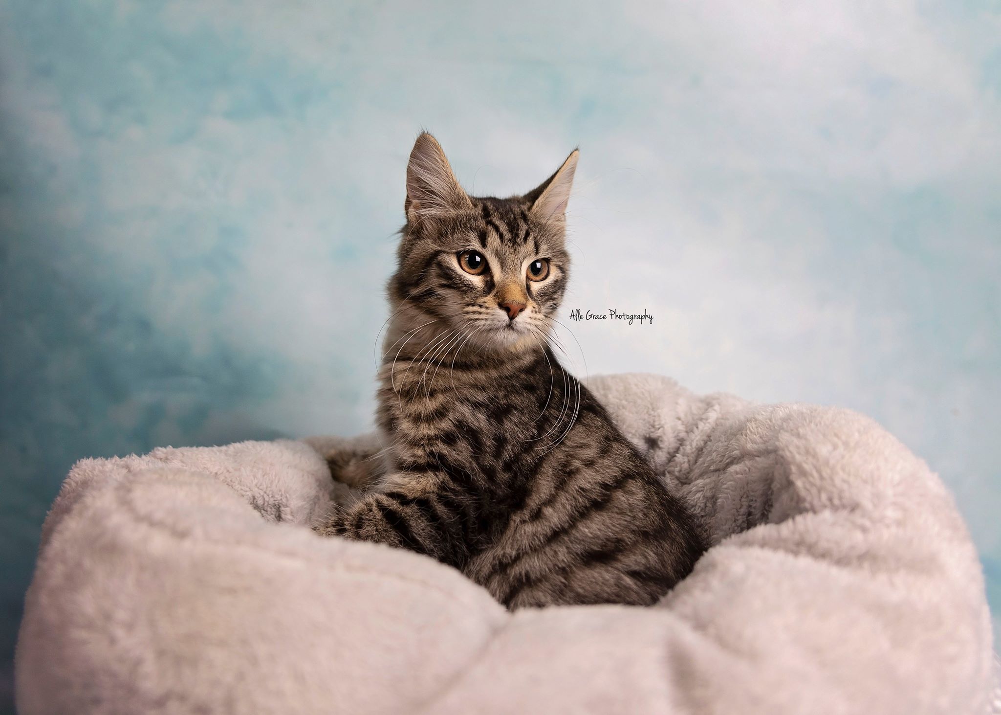 Hi, my name is Salsa FluffyTail. I’m a sweet little kitten who would love to find a warm and comfy place in your home to curl up on. I’m happy to snooze on the back of sofas, or on top of tables or desks (sometimes inside baskets), where you can pet me gently. I’ll purr like crazy when you do that! I don’t mind the occasional cuddle, but I do prefer my independence, where we can share the space.