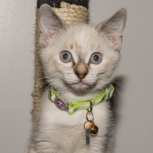 Sapphire is starting to come out of her shell. She is a fellow daredevil with her sister and races up the cat scratching posts. She has a little nest up there that she likes to guard. For a young kitten she likes to show everyone who is boss.