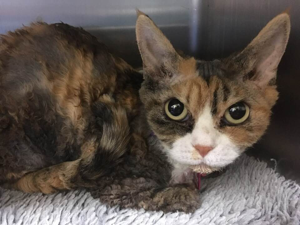 Introducing Mia - a very unique and special girl. Of course, each and every cat is unique and special but Mia is rare as well. A pure-bred Devon Rex is not something we come across in rescue that often and we know she will spark a lot of interest, with her stunning silken curls and adorable, perpetually grumpy face.