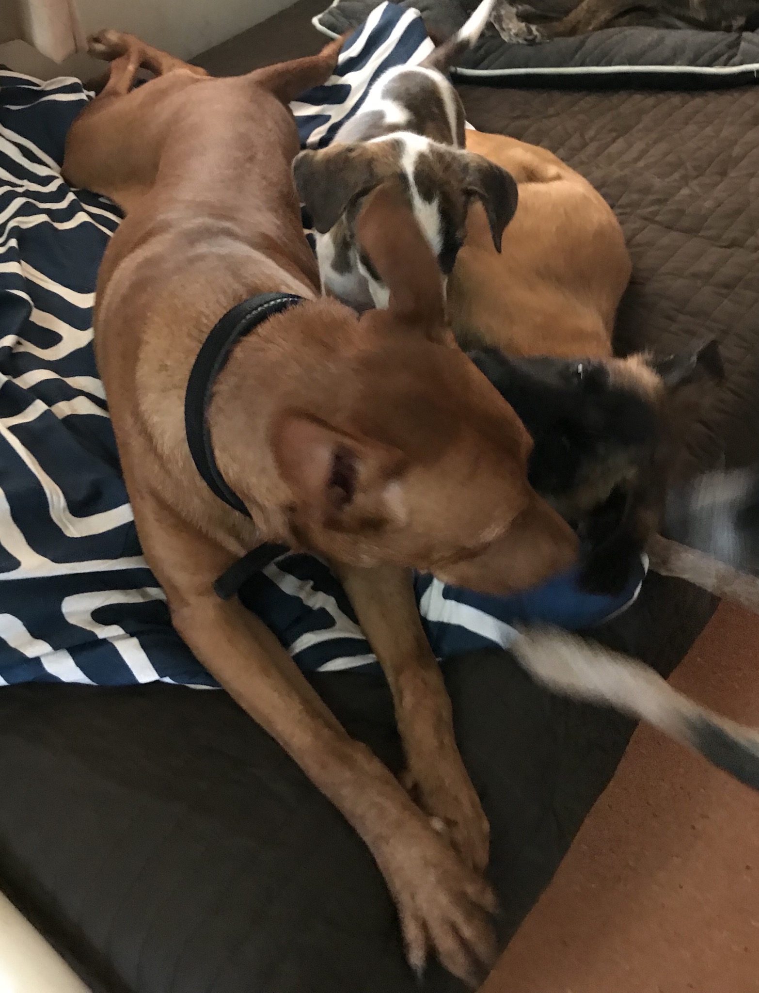 Big Red is like a great big 22 kg puppy. He has a very nice nature, and despite his manly looks is not very macho at all. He gets on with all the dogs and if one of them gets cross with him he backs off quickly. He's a lover not a fighter, that's for sure. He is often to be found curled up on a bed with a couple of other dogs, sometimes with a puppy tucked into him. He plays with the other dogs nicely, and loves it if one of them will play tug with a tug toy. He is also very playful and gentle with the puppies, who think he is the bee's knees. He really enjoys the hard dog toys that squeak and loves balls as well. Red is a very smart dog, and very trainable. He has already learnt to walk nicely on the lead, sit while his dinner is being put out, and has stopped jumping up. He often wanders up for a pat, pushes his big head through the other dogs and puts his head on your lap for a lovely pat. He is so affectionate and loving. He has a bush walk off lead with a bunch of other rescue dogs every day, and while he enjoys his walk he doesn't run off, just explores as he goes along and keeps close by and in sight. He is a good boy too at coming back when he is called. While Big Red has a moderate exercise requirement, but because of his intelligent active mind, he has a high stimulation requirement.