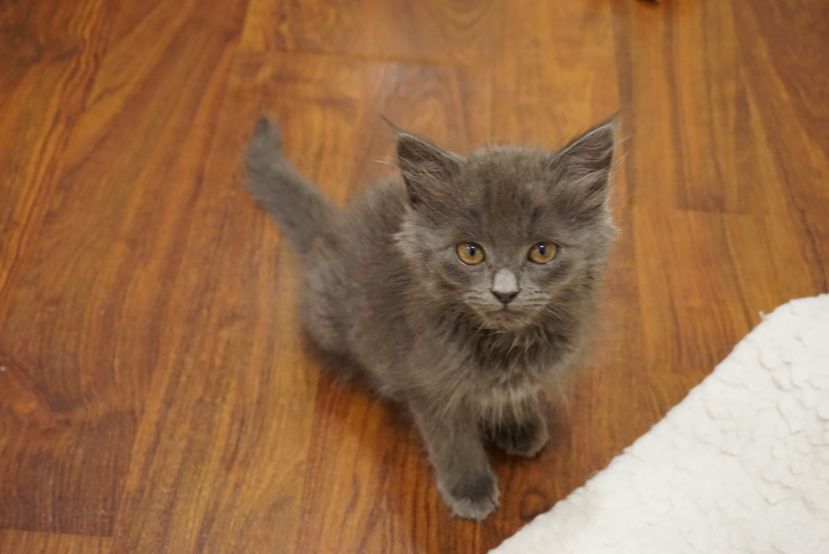 Amelia is a beautiful grey domestic long hair kitten who wants nothing more than to sit and watch as her two brothers beat each other up.