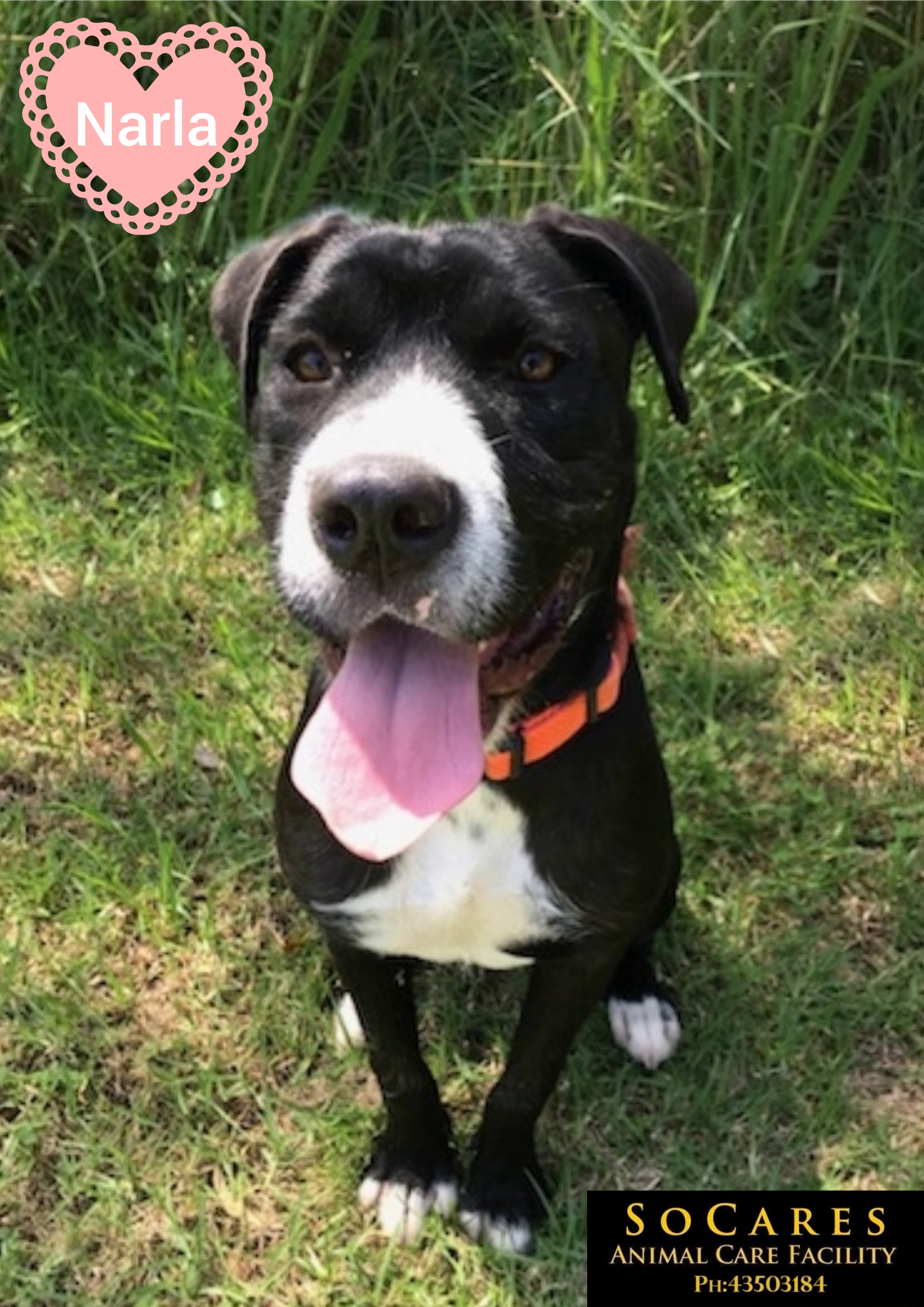 Narla is a darling and she has some lovely qualities. Narla relishes receiving affection and for her age Narla is quite well behaved. Narla can be a little submissive when she first meets new people but once she realises that you are friendly, Narla will cover you with kisses. Narla has previously lived with another young female doggie friend and she has displayed nice manners when she has met her other pound buddies. While at SoCares, Narla has showed little interest in cats.