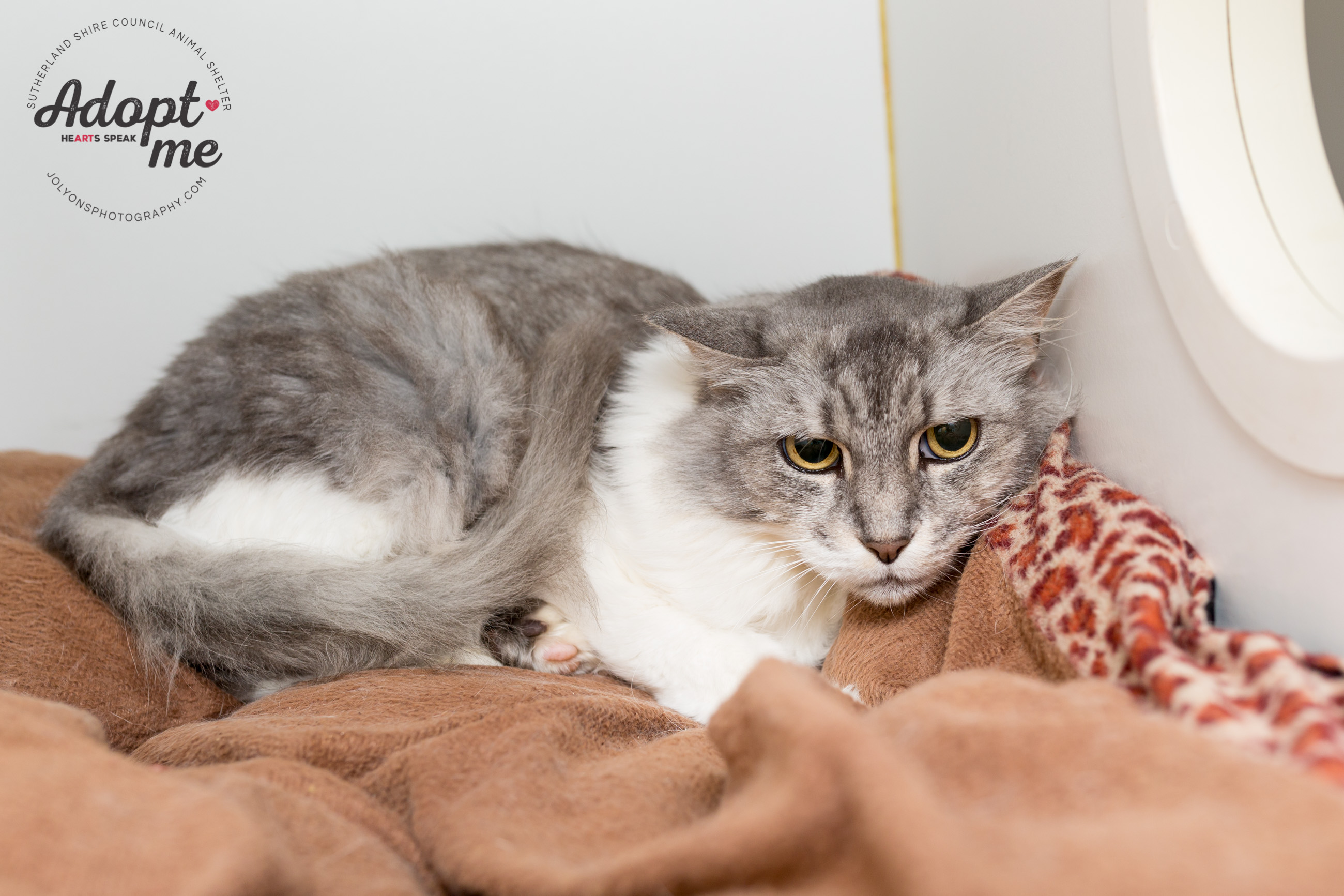 Kind and quiet Kaitlyn is really on the lookout for love and she deserves nothing more than an understanding and totally perfect home. Kaitlyn came into us as a terrified stray cat that hasn’t seen much love and seems to have been on the street for some time. She has a stunning grey and white long coat and big golden eyes that are so afraid but look deep into you, longing for some peace and love. Kaitlyn has not once lashed out or displayed any hostile behaviour, when she is scared she just tries to make herself as small as possible and hopes people will leave her alone. We have been doing lots of work with Kaitlyn and she now doesn’t shy away from pats or scratches and will sit gently in her condo and accept sweet talks and treats. Kaitlyn will benefit from an understanding owner who is dedicated and loyal and wants to work at getting Kaitlyn as comfortable as possible, and gain her trust so she may be able to enjoy her life in the company of someone truly special that loves her for the fantastic feline she is.