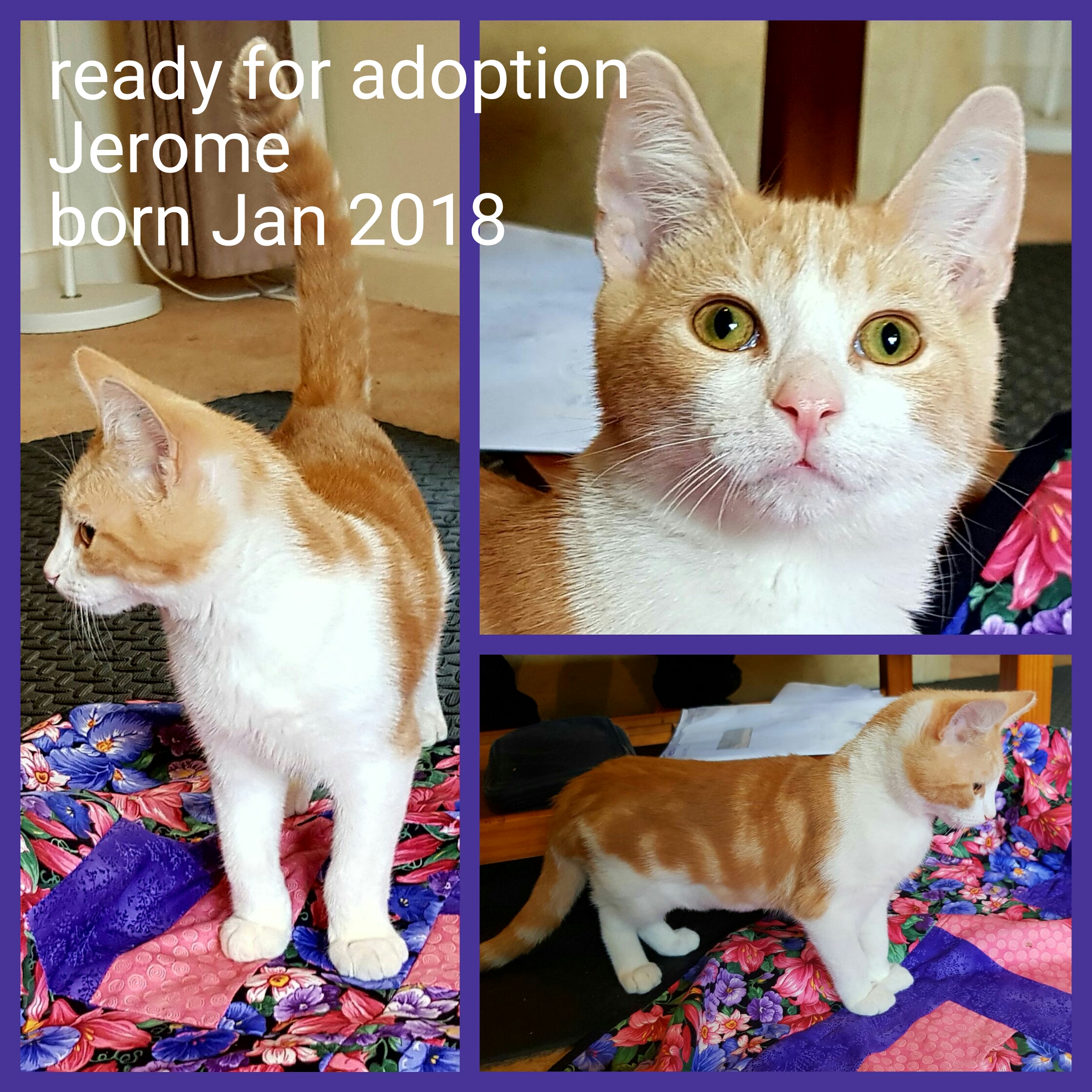 With his bright ginger and white coat, shining cheeky eyes and the cutest little snub nose ever seen, Jerome would suit any family looking for a 2nd playmate for an existing kitten or adult cat or indeed canine as he is dog friendly. Infact Jerome just wants to be friends with everybody!
