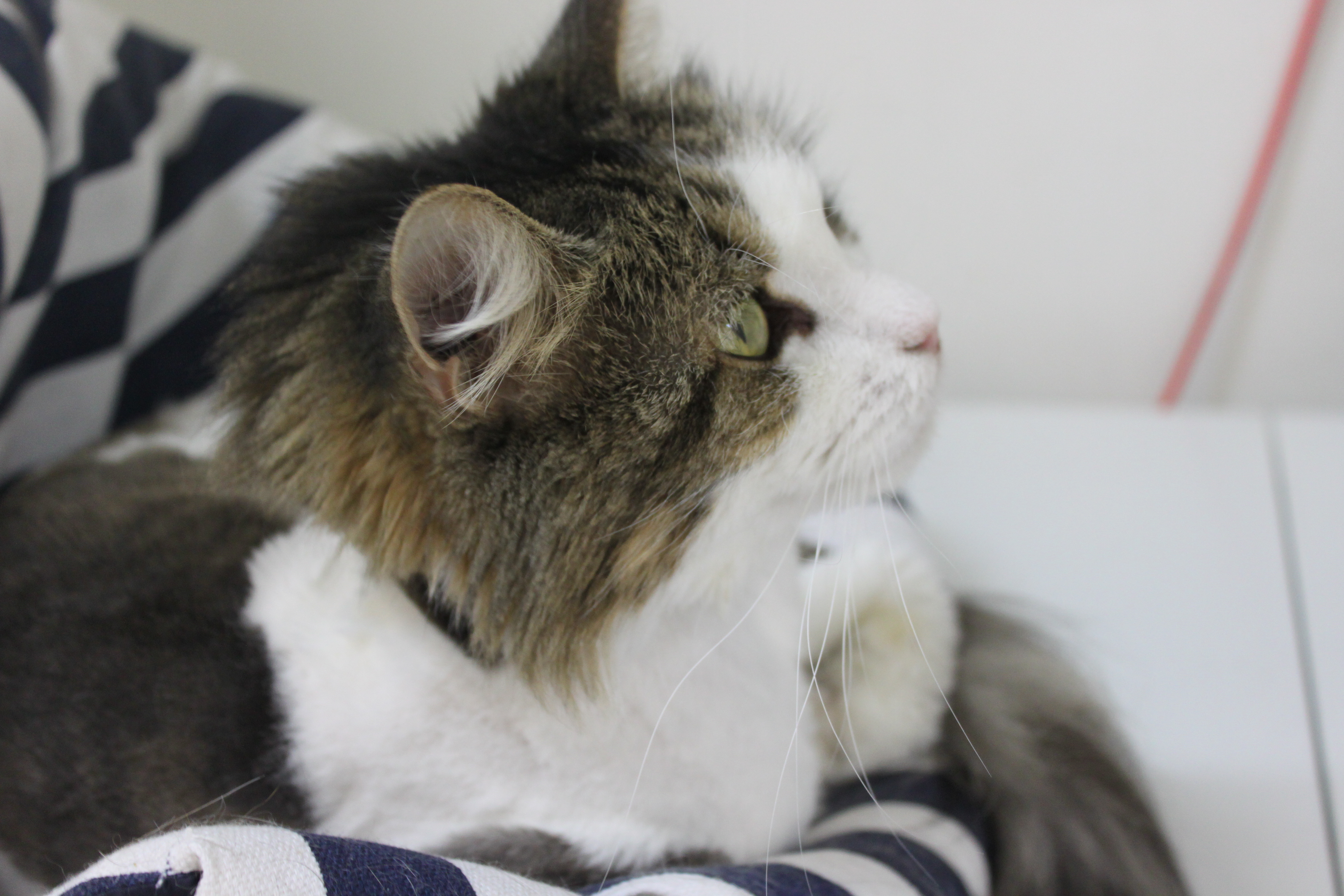 She is a stunning cat who bonds well with humans and choses to sit with them for much of the day
