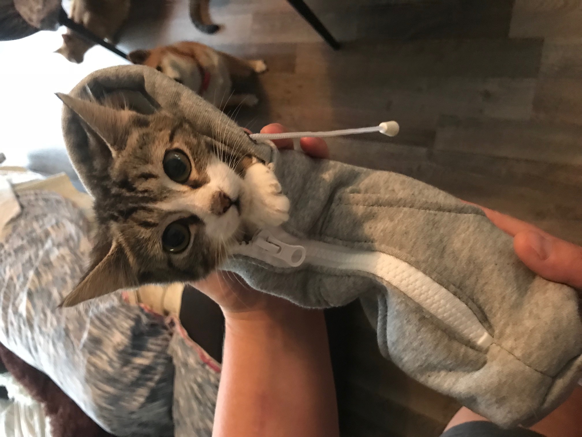 She was rescued and brought to us as a tiny, skinny kitten. We have spend the last few weeks getting her used to people and other animals and the world all of a sudden isn't so scary for her!
