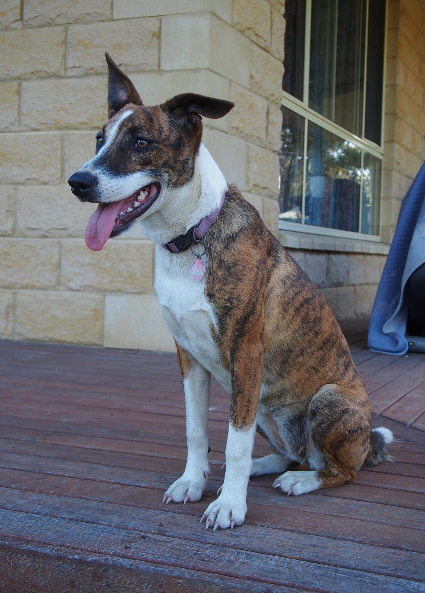 Lissy is possibly a staffy x kelpie mix. She is quite an independent little girl, happy to do her own thing, but will let you know when she needs you for something. She sleeps inside but spends her days outside running with her foster pack. She loves swimming in the dam. She is defensive of her yard, and takes a while to warm up to other dogs. Probably not good with chickens or cats. Lissy needs a secure yard with solid fencing as she can climb wire and mesh gates. Lissy is on the small side of medium - maybe 12-15kg.