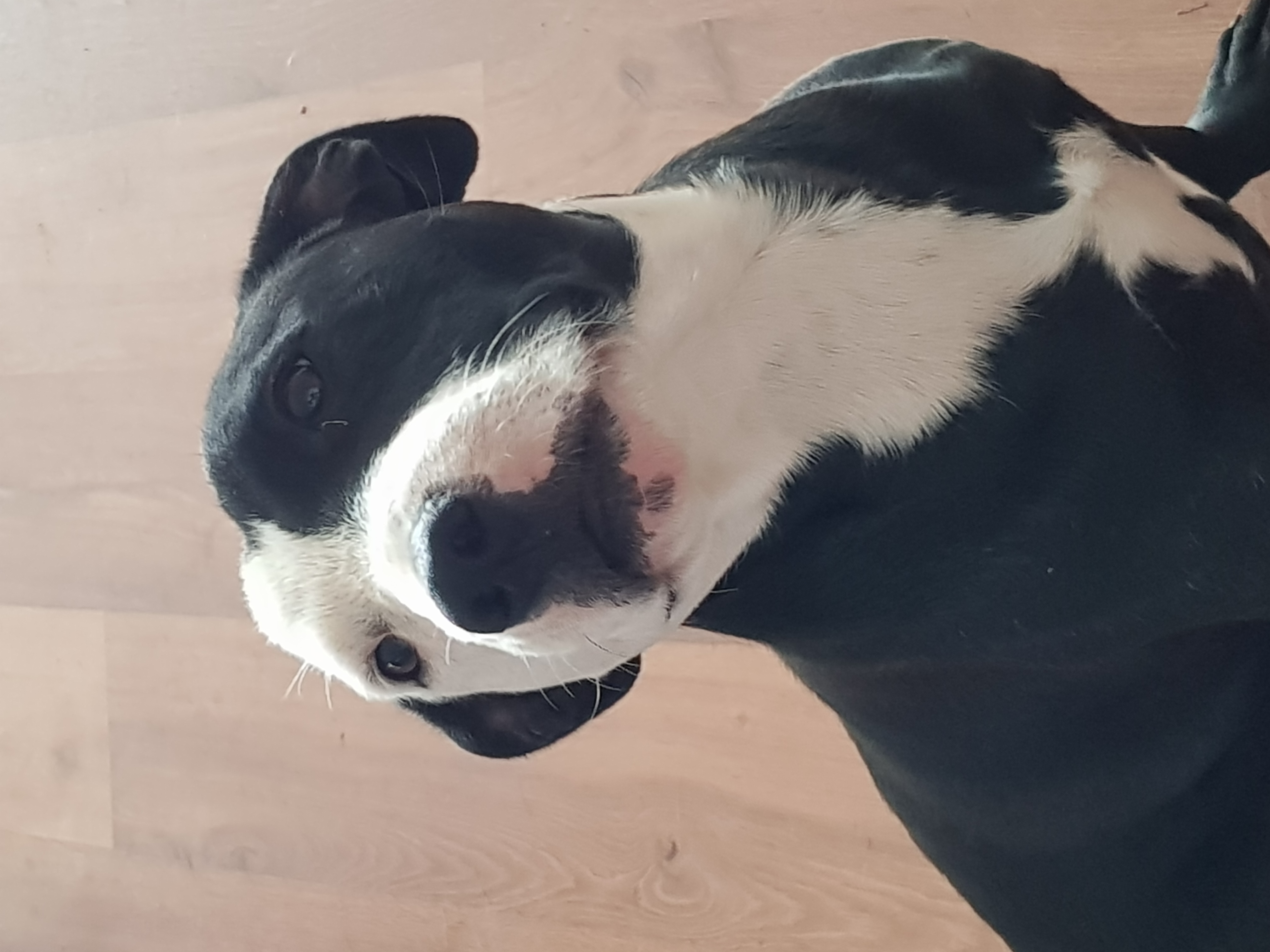Eric, is a small black and white staffy boy of about 12 mths old and is your typical staffy. He loves life, loves people, loves walks, loves food and loves to play.. He is still learning what personal space means with other dogs but he will get there.