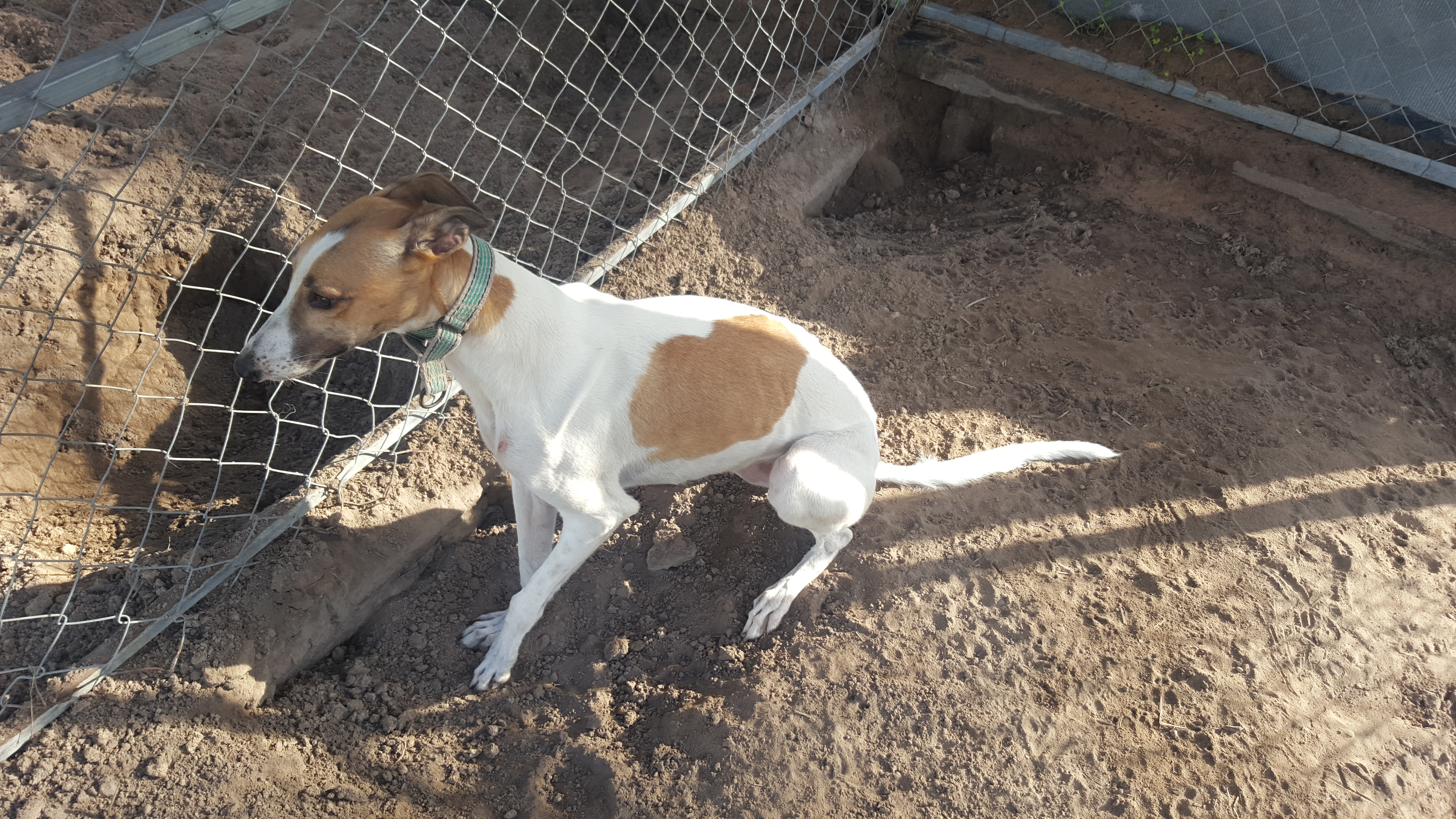 Molly is a small grey who was too slow on the track so came into our shelter along with Khan. A lovely natured dog who gets along with big and small. She had an injury to her leg and needs someone to work with this to get her back on her feet so to speak!