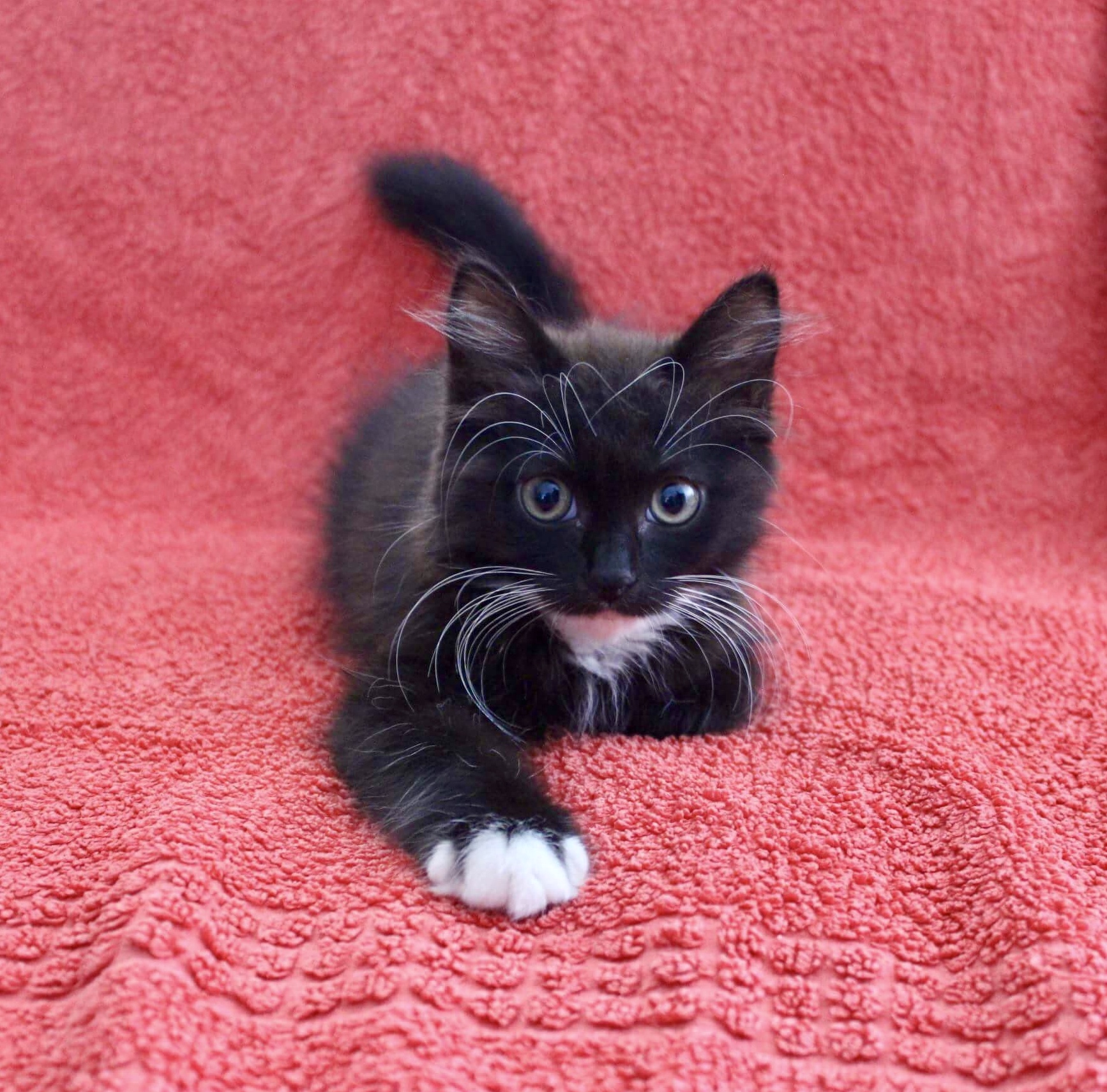 This total fluff ball is a crazy character. One second she’s an absolute snuggler, the next she’s chasing her tail! Kiana looooooves food. Especially roast chicken or whatever your having for dinner. You can always find her at the top of the kitty tower watching the chaos before pouncing down to join in the fun. She loves snoozing in bed and having a chin scratch. We’re predicting her to be a big and fluffy cat who may need grooming when she’s older. Kiana would be best suited to a family with older kids or a young couple looking to add a fur baby to their family.