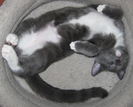 Hannah is an adorable, chatty, charming, happy girl who loves to purr. She loves other cats and is her own unique self being able to sleep in many a position as her second photo shows. She is a little timid at first because she was born and kept in a box with her mum and siblings until she was brought to andrea. Please give this girl a home