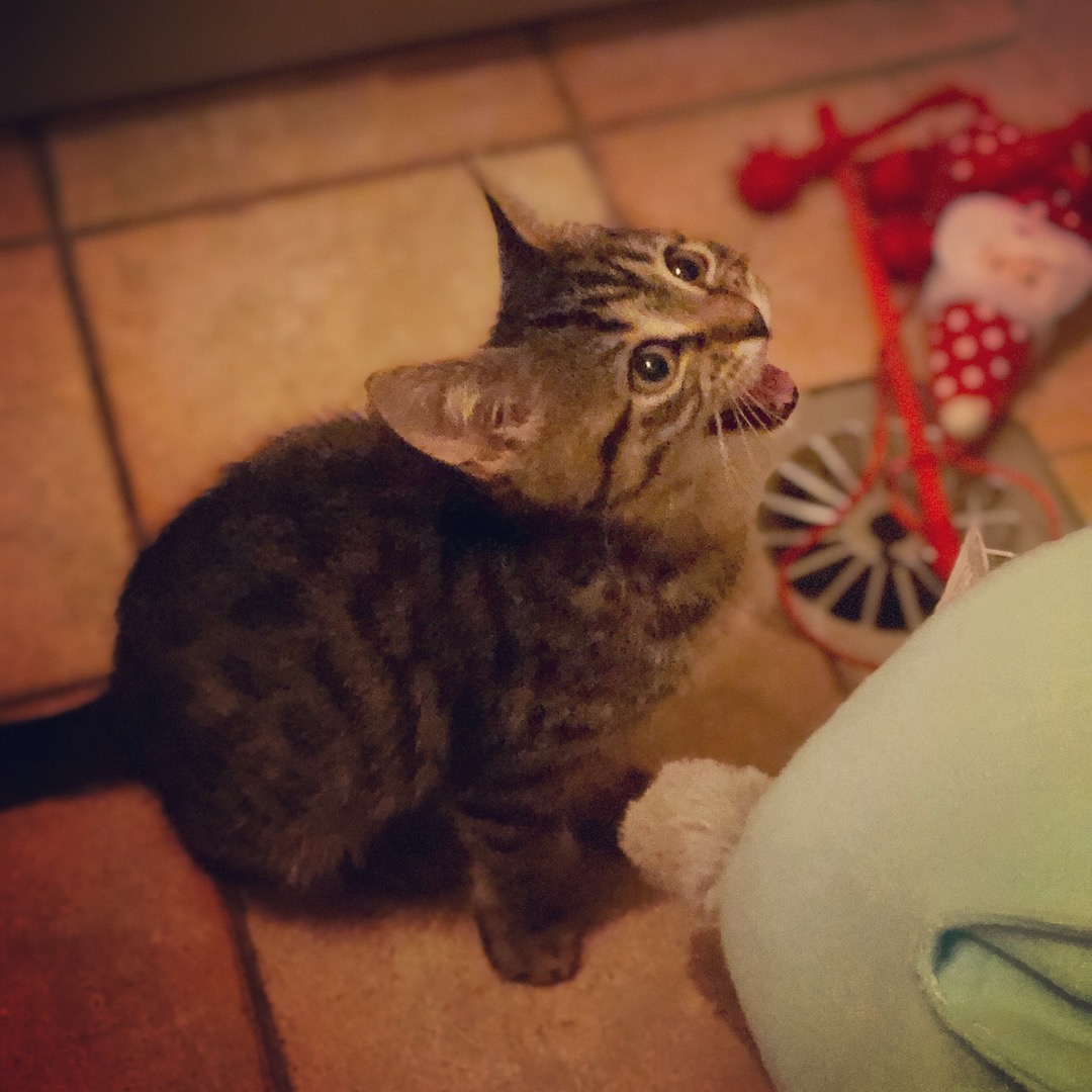 Today this little bundle of joy enjoys her meals. Uses her litter box and loves a good romp.