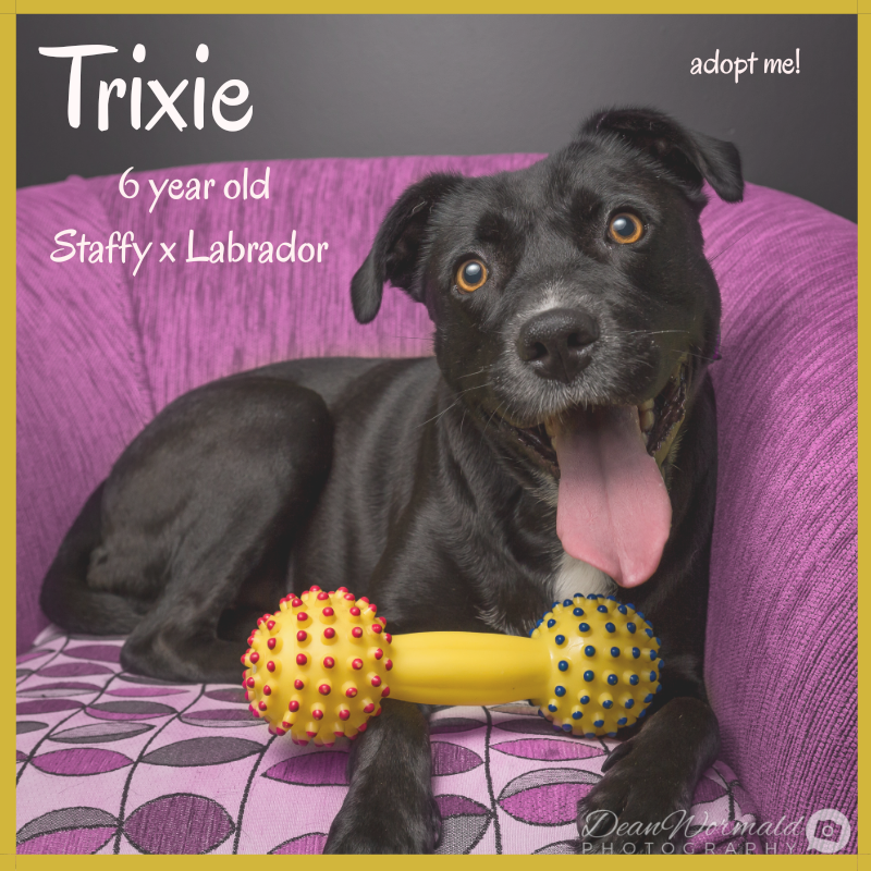Trixie would suit full time workers as she happily entertains herself with her toys. Did I mention toys, Trixie loves them, all dog toys and she can be a bit protective of them if there is another dog. She is dog friendly but doesn’t need a furry friend for company.