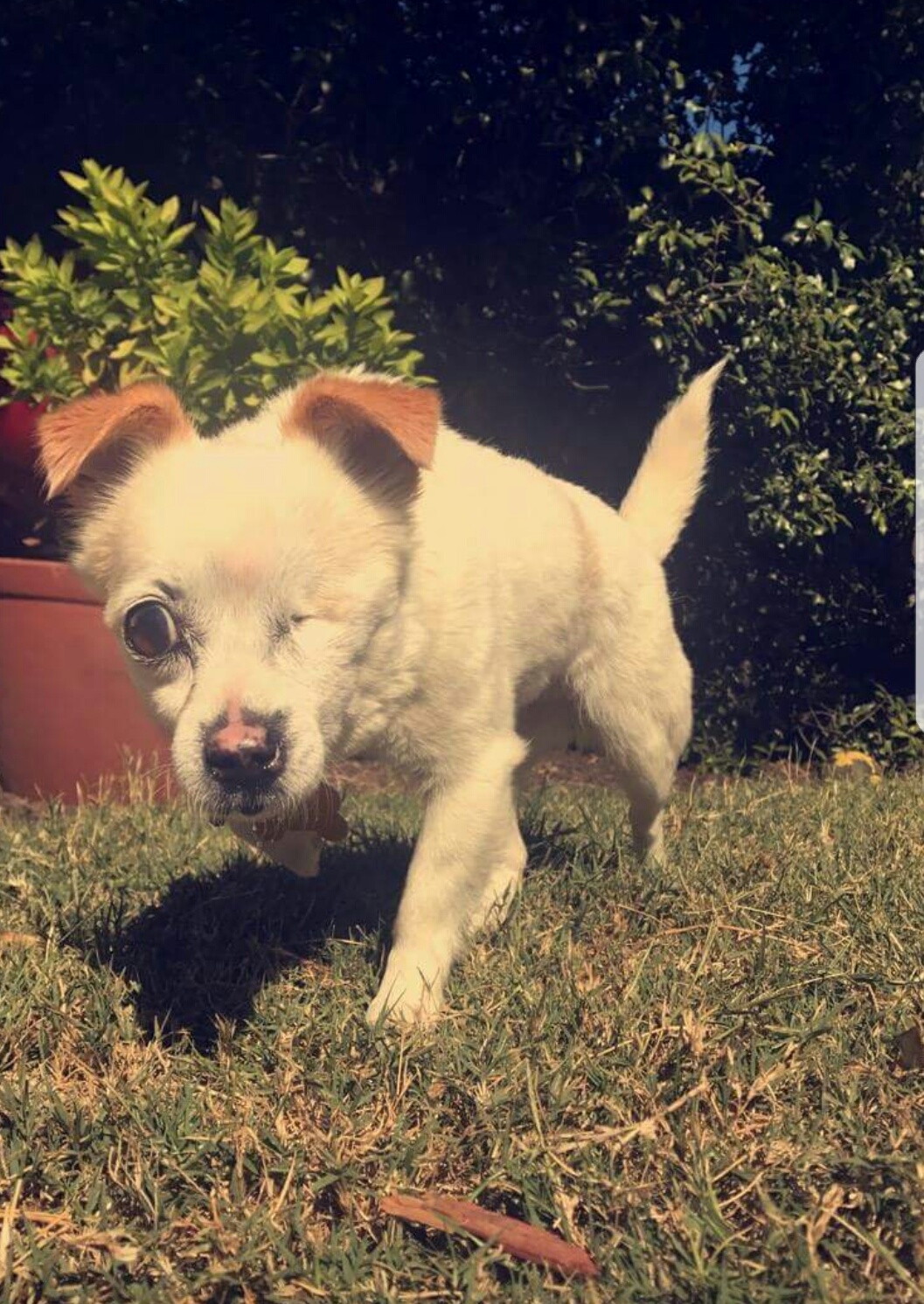At 12 years old she has her quirks and can make you smile with her goofy and happy additude. She is a confident girl even with the loss of one of her eyes, however if approached on the wrong side she can get startled, whether it's a another dog or even a human, so a family with young kids wouldn't be best for her. She really likes dogs and would love to live with one though maybe not a playfully puppy. She also gets on with cats.