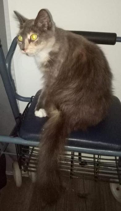 Hello I am the pretty Miss Paige. I am a lovely Ragdoll X, I have long soft hair, in black and ginger, I have a white chest and a beautifully patterned face. I enjoy riding around on a mobility walker, I would make a loving and caring therapy cat, spending time with you, staying with you on you walker, keeping you company. I am a sweet young lady who is easy to care for. I would love to just lay in your lap and be brushed all day. If you are looking for a therapy/companion cat, please consider me, and contact the rescue.