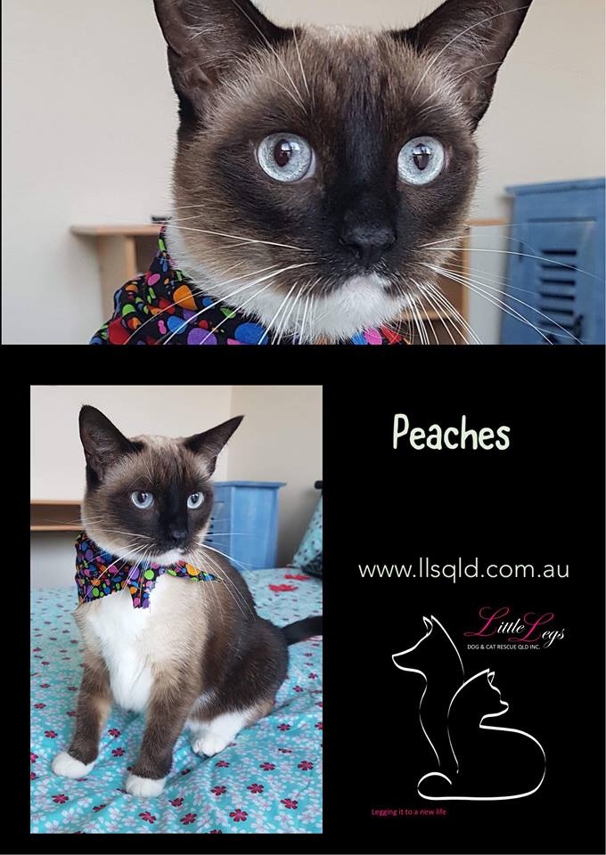 Peaches needs a few days to settle into new environments, so will need an owner who has patience, but you will be rewarded with your own very best friend.