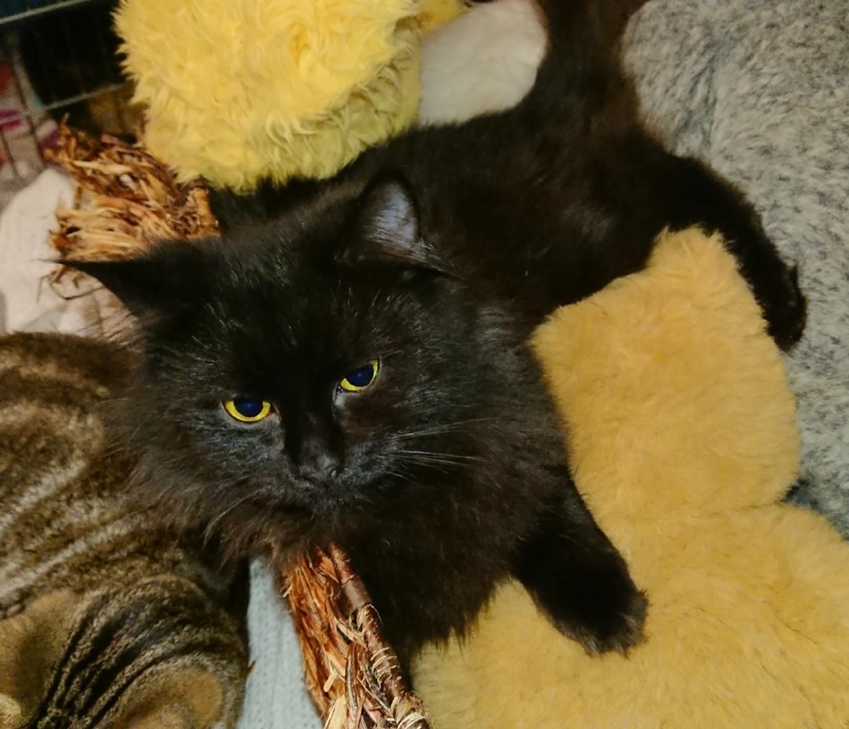 This Sasha is an absolutely stunning looking long haired black cat with yellow eyes.