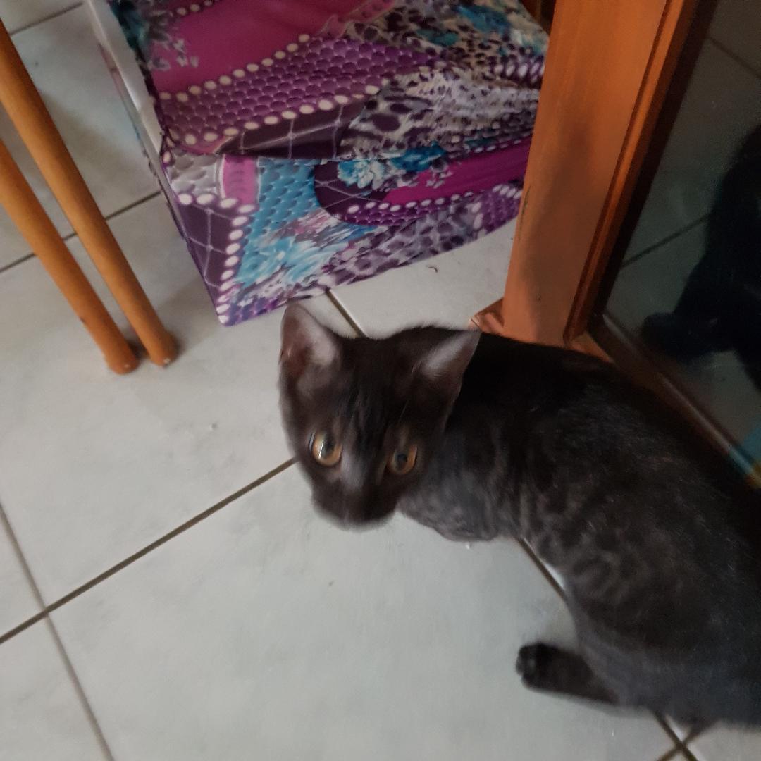 Being a black tabby has unusual colours with white on her underbelly. Well suited as an indoor and outdoor cat.