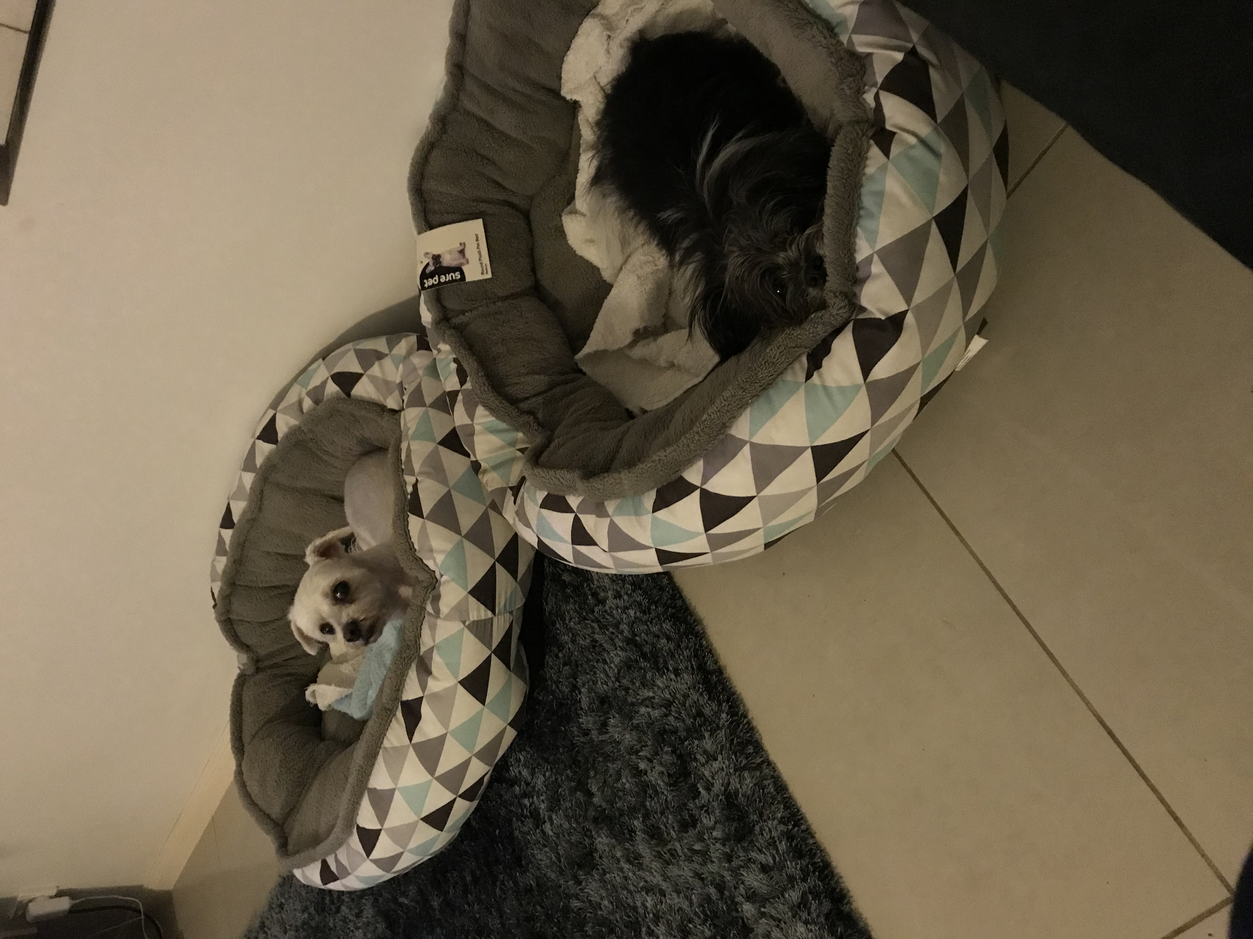 Bonded pair. Shnoodle and Flo are easy calm quiet and very affectionate. These two girls don't act or look their age, they are fit and healthy and enjoy walks and weekends away. If you met them you would think they were half their age. They are extremely well behaved and love going in the car and making friends.